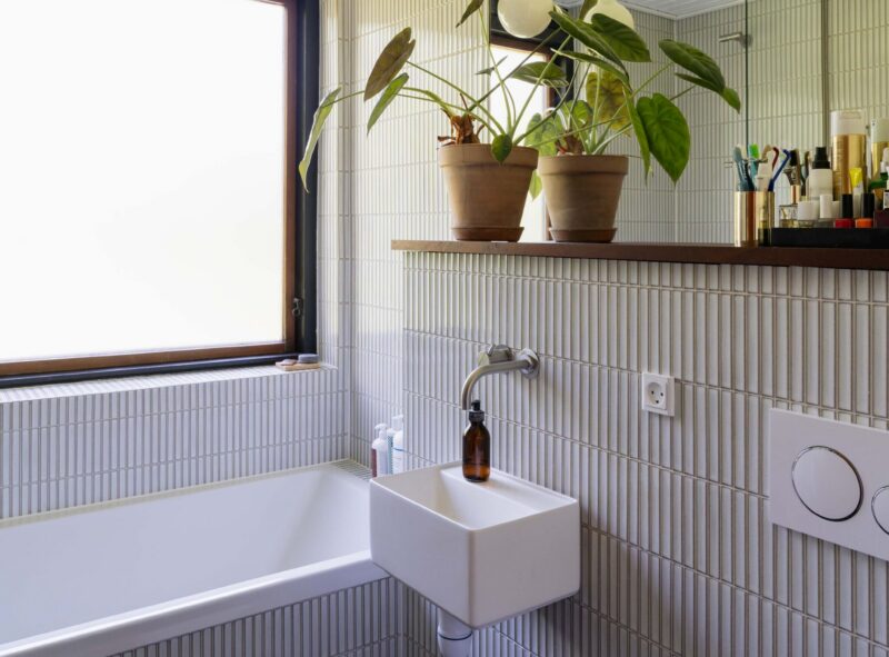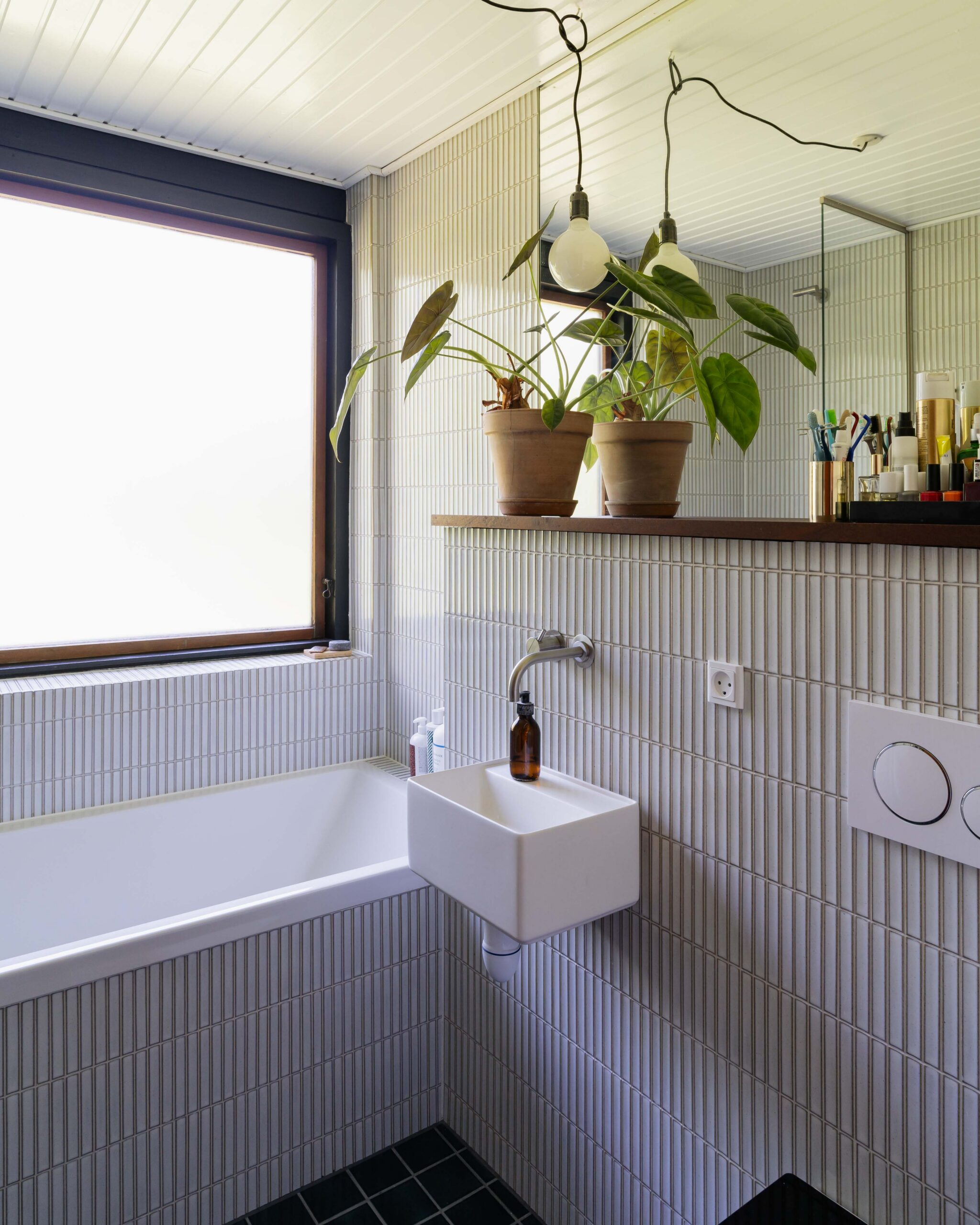 Klinkerne på badeværelset er fra Marokk, og er anvendt som en nyfortolkning af badeværelsets oprindelige blå 10×10 fliser. I bryggers og toilet er der lagt et ternet klinkegulv, som en hilsen til husets tidligere ternede korkgulv.