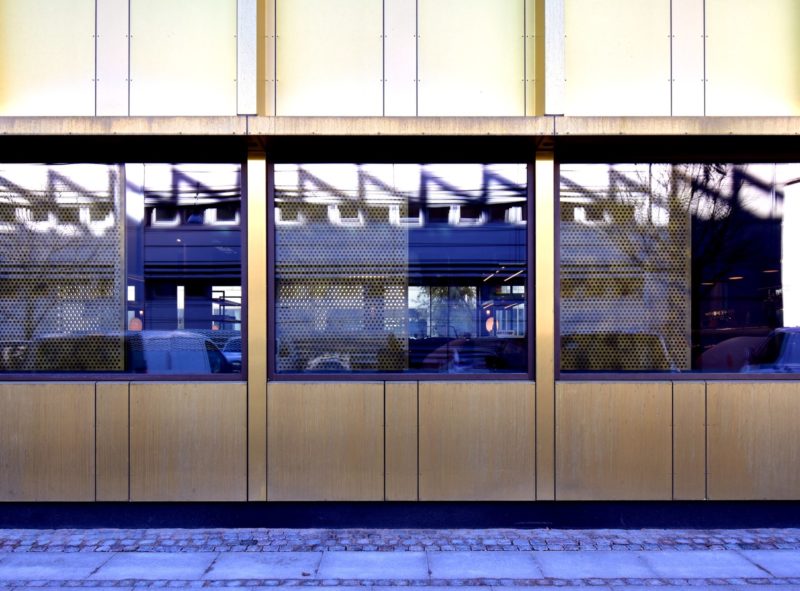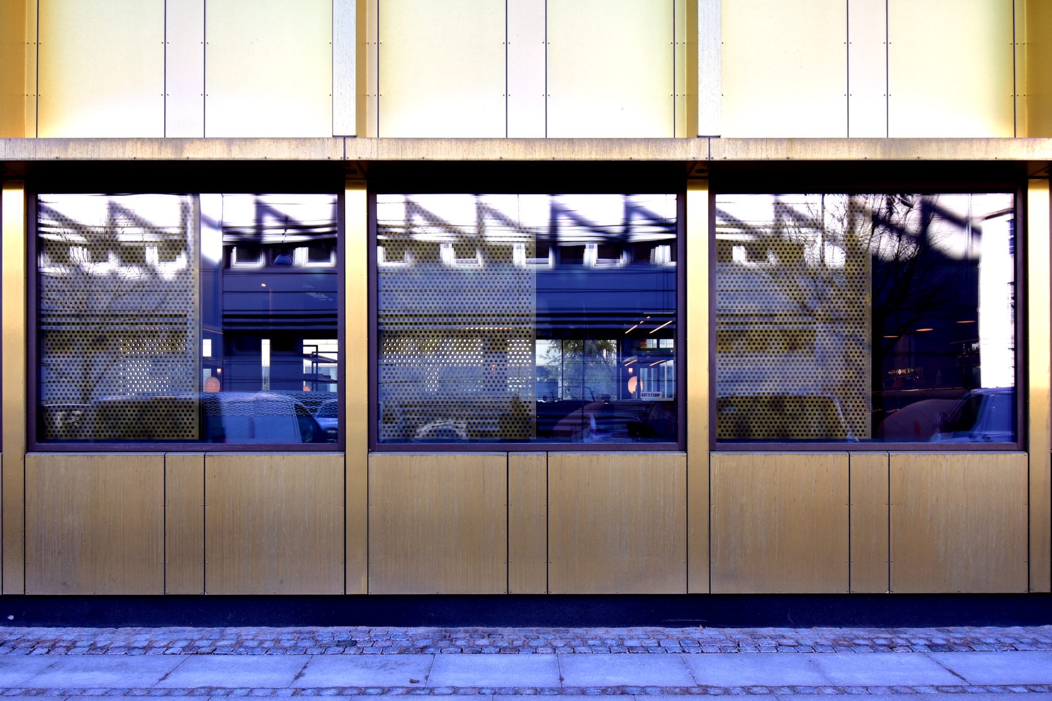 Der er arbejdet med en indvendig og udvendig facade, hvor den ubehandlet indvendige aluminiumsfacade går i samspil med nabobygningens stof og materialitet.