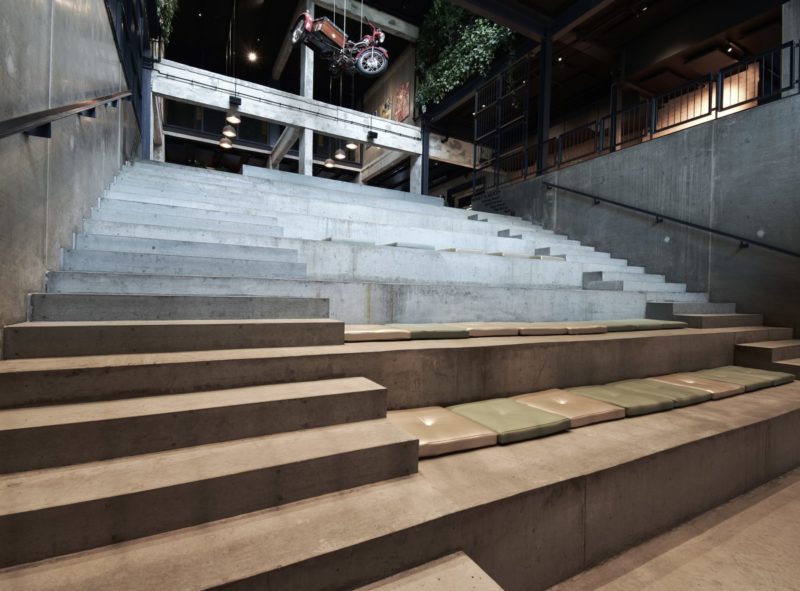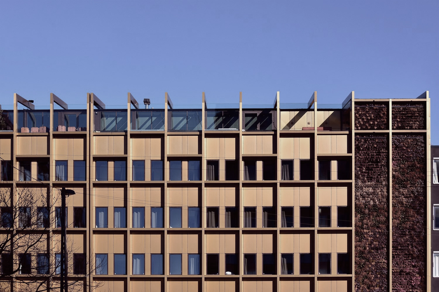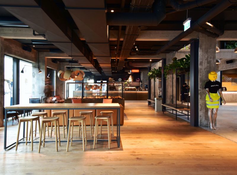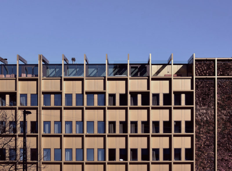 ”Når man skal omdanne en kontorbygning til et hotel, og der samtidig er et ønske om at tilføje en ekstra etage, så skal bygningen pludselig kunne klare en større belastning end tidligere. Det har resulteret i nogle meget synlige indgreb, hvor vi har forstærket de eksisterende søjler og vægge med markante stålrammer. Det ville være et problem i mange andre byggerier, men i det her projekt har Arp-Hansen og Kim Utzon Arkitekter fra start ønsket et råt look.