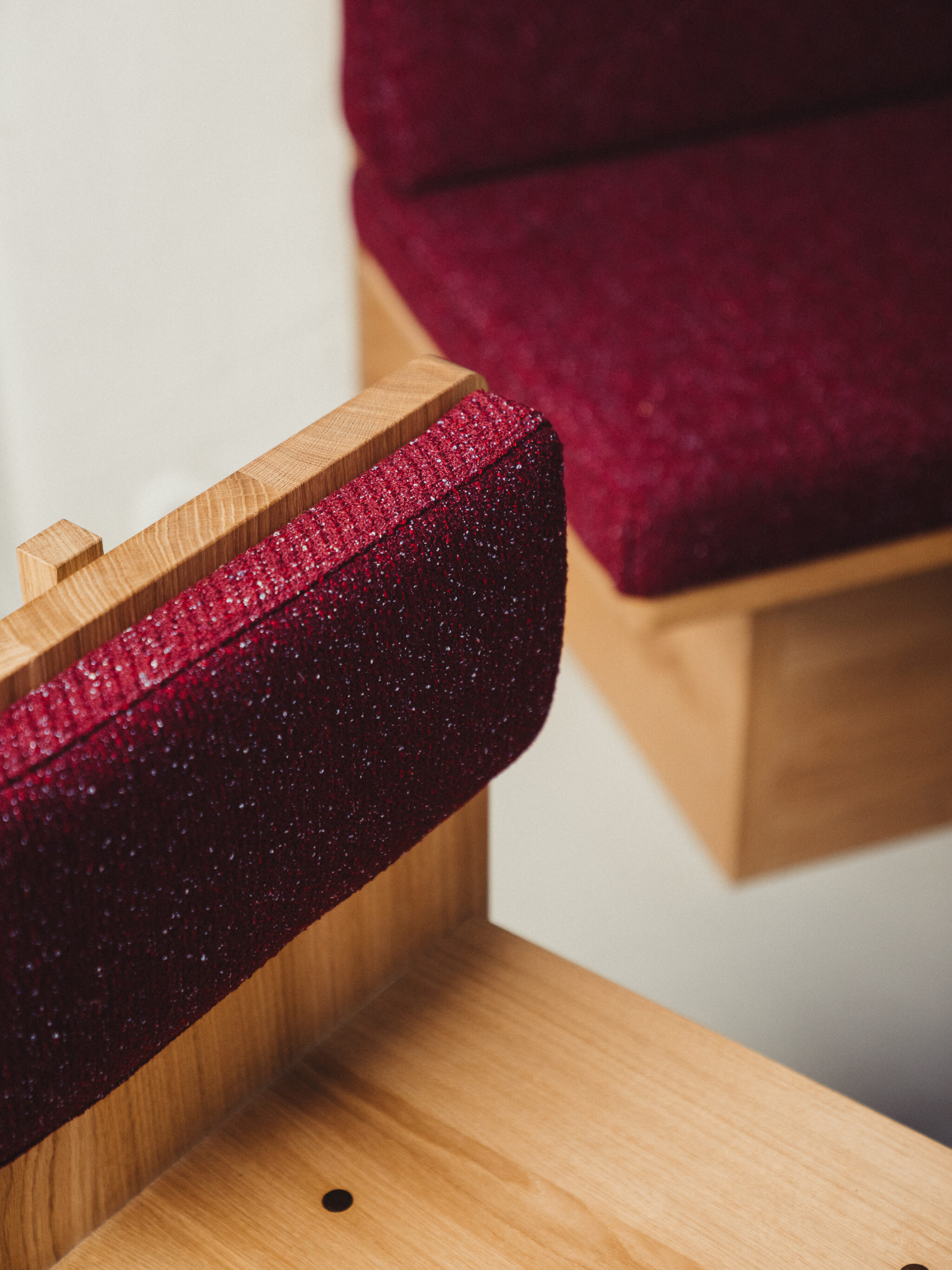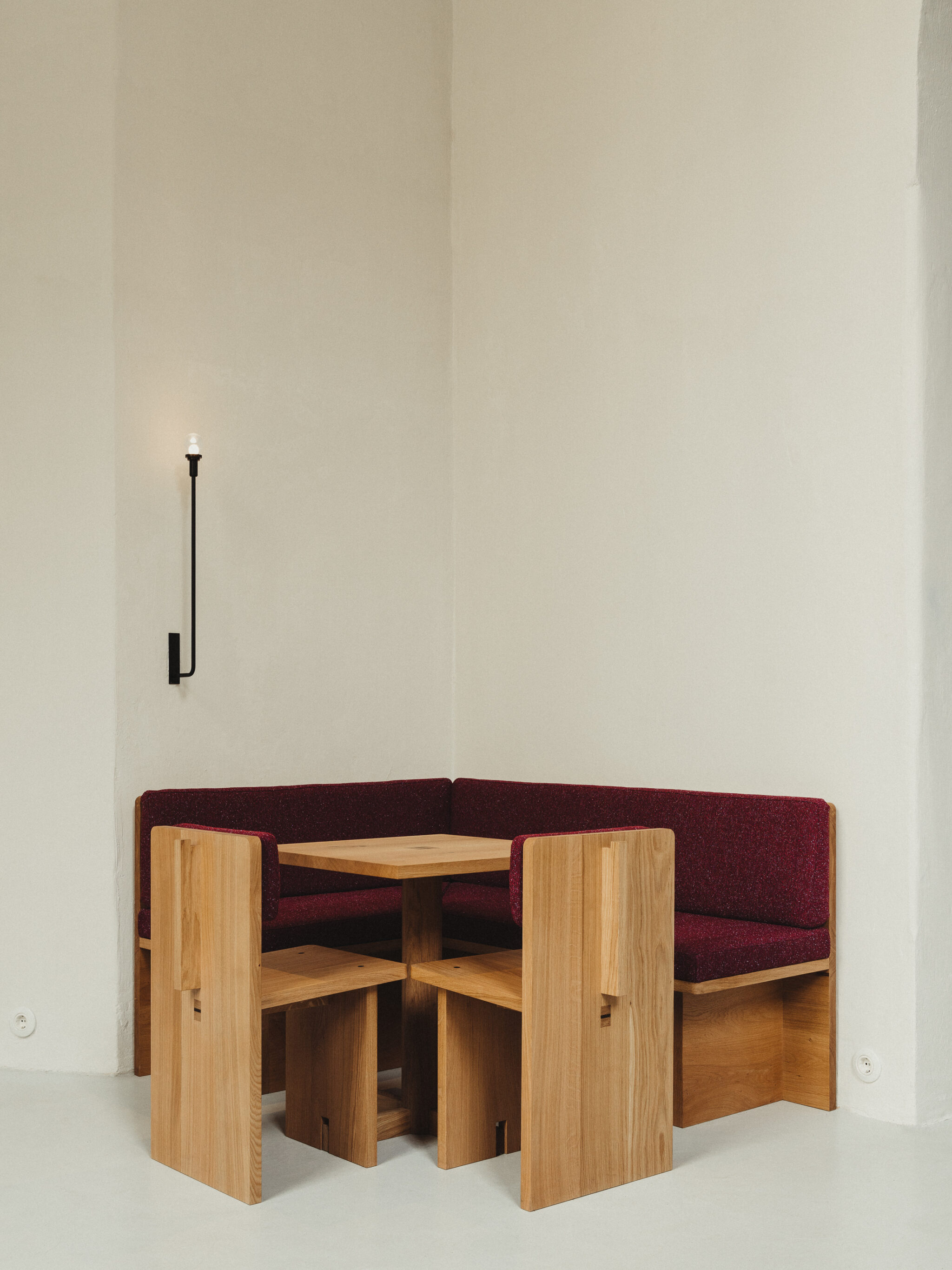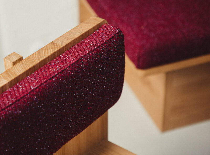 Alle møbler er snedkereret på højt niveau, og alle med en usædvanlig detaljemæssig omhu, der lader brugeren 'aflæse' møblernes tektonik og gå på opdagelse i de særlige detaljer og dekorative udlusninger. Kobberet, som refererer til kirkens tage, vil påtage sig sit eget liv nu igennem en patinering, der aldrig stopper.