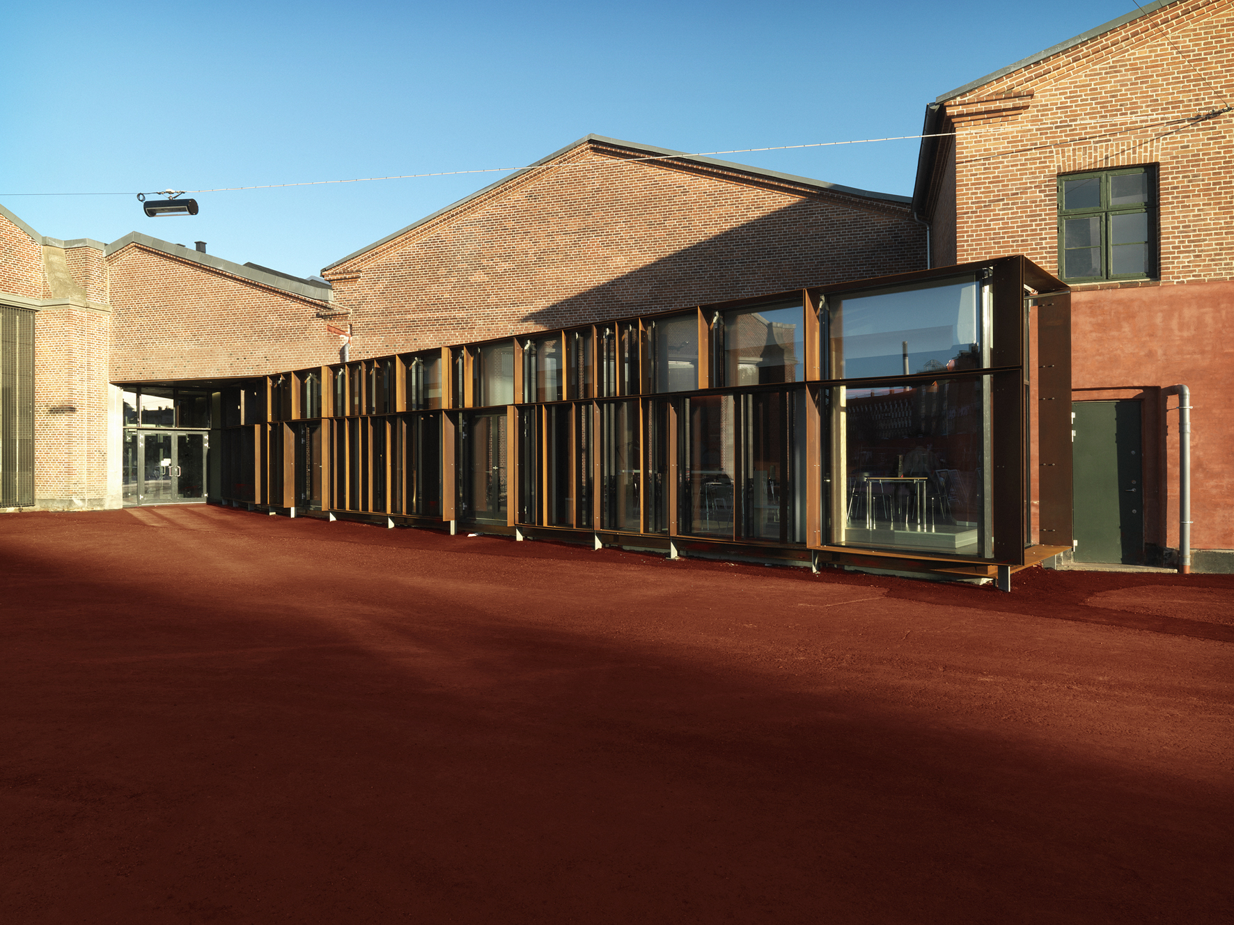 Hallernes imponerende murværk, der gennem en årrække, er genoprettet, er tilføjet en “kant”, der bidrager positivt til oplevelsen af “det markante bygningsværk” og samtidig inviterer ind i “øjenhøjde” – inde som ude.