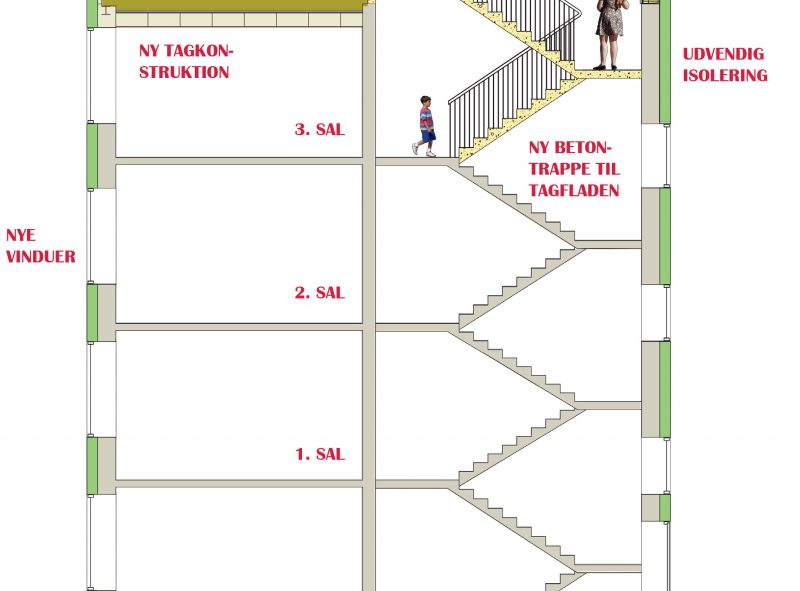 Bygningen var langt fra nutidens energikrav. Derfor blev der arbejdet med en udvendig facadeisolering som efterfølgende blev pudset op og samtidigt nye lavenergivinduer, samt nyt tag med isolering af tagkonstruktionen. Samlet set er ejendommens energiklasse flyttet fra F til C.