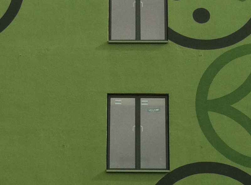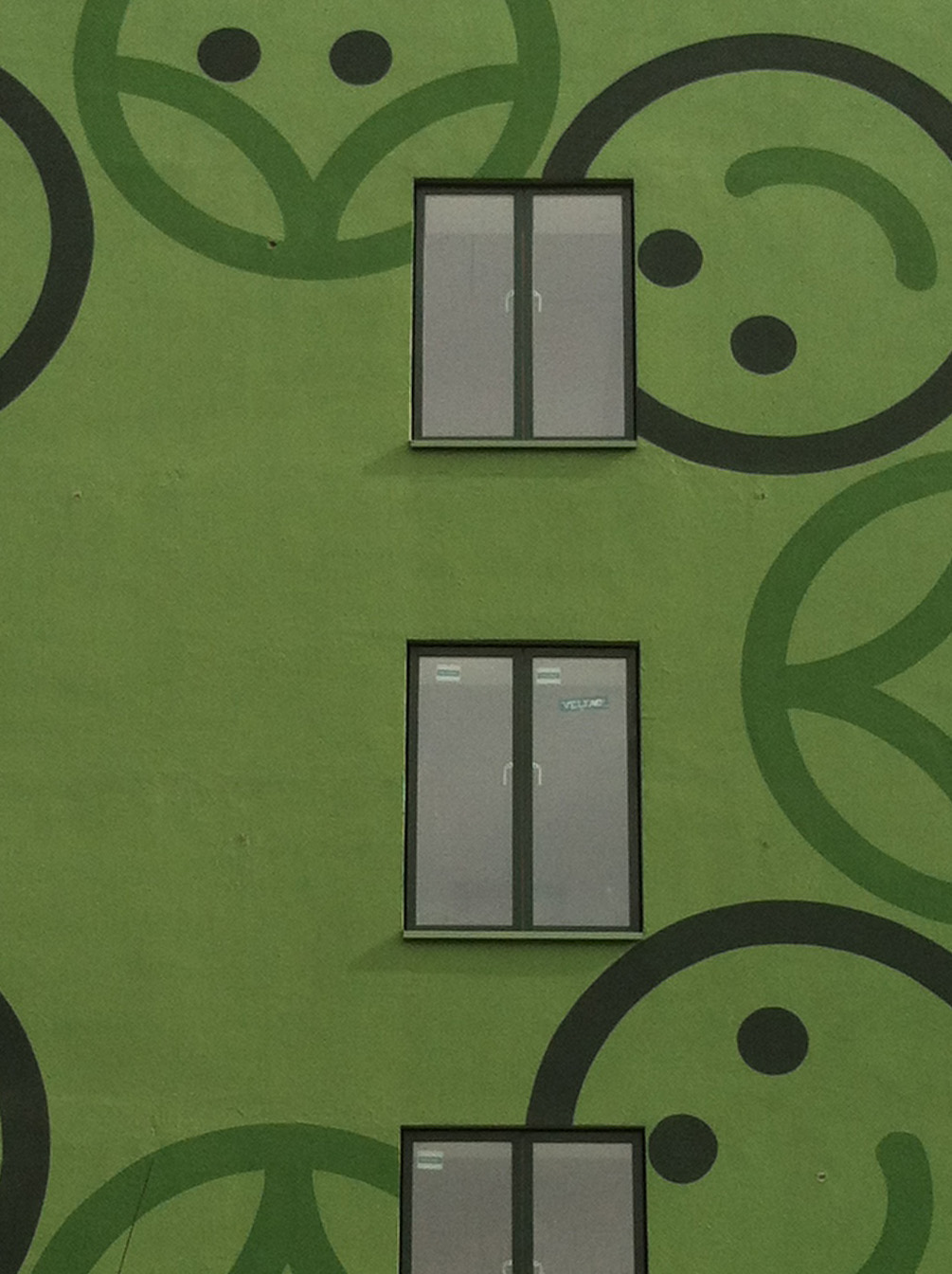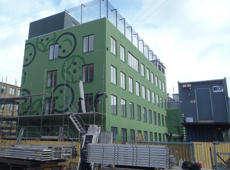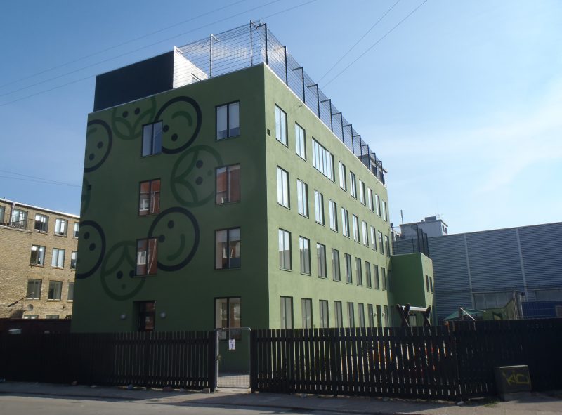 Den pudsede facade blev en flot funkis grøn og med tilladelse fra Center for Bydesign blev Børneringens logo tegnet op på facaden i to mørkegrønne toner. Logoet består af 8 barneansigter, som former en ring. For at logoet skulle fylde på facaden blev hvert ansigt tegnet op med en diameter på ca. 2,3 meter, og logoet blev foldet omkring bygingen, så det er synligt fra flere retninger.