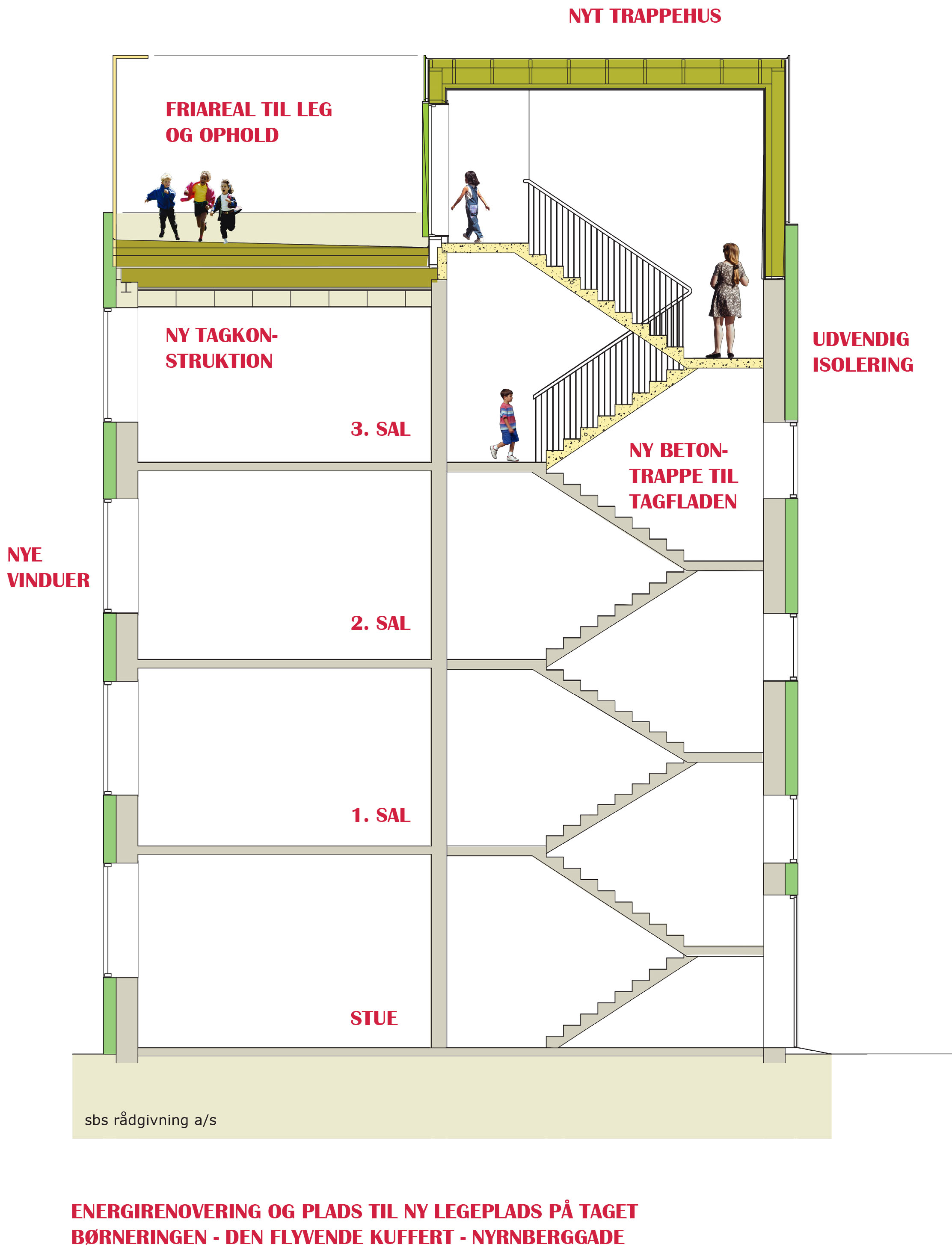 Det var en meget stor bygning, som kunne rumme mange flere børn, men med et alt for lille udeareal. Bygningens oprindelige formål havde ikke været institution, og indretningen var utidssvarende. Børneringen ønskede at renovere og energioptimere bygningens ydere skal, så den kunne fremstå moderne, energirenoveret og tilpasset institutionens behov. Renoveringen skulle koncentrere sig om facade, vinduer og tag. SBS rådgivning fik opgaven og entreprenør Ole Jepsen A/S blev valgt til hovedentreprisen. Ifm. tagrenoveringen skulle den oprindelige tagkonstruktion fjernes og der skulle gøres klar til etablering af legeplads på taget, som supplement til friarealet på terræn.
