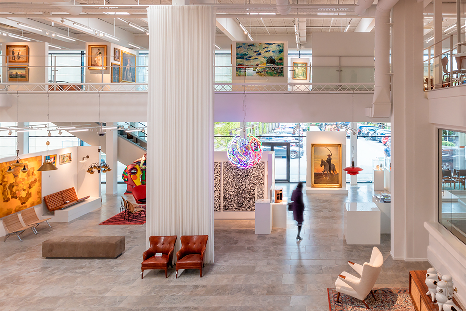 Indgangspartiet giver samtidig adgang til det lyse og varierede udstillingsområde i stuetagen og på 1. sal, hvor man ganske gratis kan gå på opdagelse i de mange store og små effekter i forskellige prisklasser, der skal sælges på en kommende auktion. På trods af stor sikkerhed er adgang til udstillingen bevidst holdt åben og uhindret. Udstillingen består af en række sammenhængende, men meget forskellige udstillingsrum. Udstillingsrummene er møbleret med fleksible udstillingsvægge og podier, men domineret af de mange effekter der udstilles. Auktionshusets mange auktioner betyder at udstillingen udskiftes løbende, så hele udstillingen er udskiftet ca. hver 14. dag.