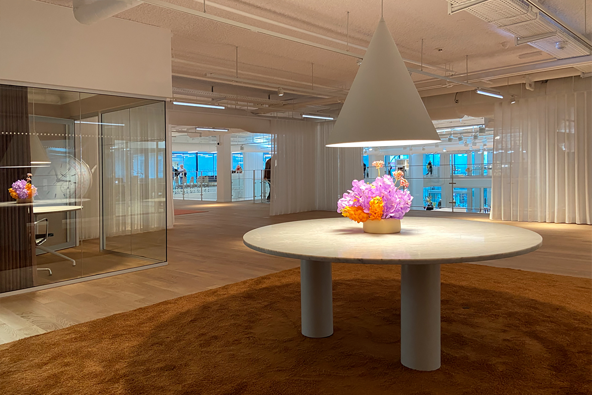 De store rum er skaleret af en række særlige XL-møbler i form af trappe- og opholdsmøbler samt skranker og bænke.