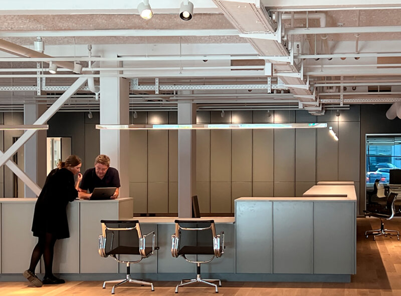 I Projektet er undersiden af alle eksisterende betondæk påført hvide akustik spraylofter med gode akustiske egenskaber, hvilket har resulteret i den maksimale rumhøjde i de enkelte rum. Samtlige tekniske installationer er herefter malet hvide. Resultatet er et gennemgående industrielt og homogent loft, der både er ressourcebevidst og imødekommer brugerne ønske om fleksibilitet og rumlighed.