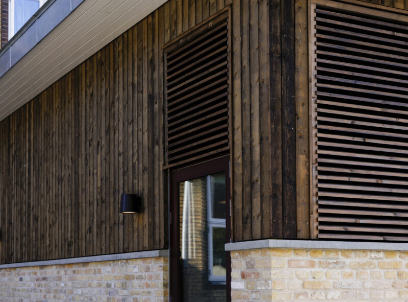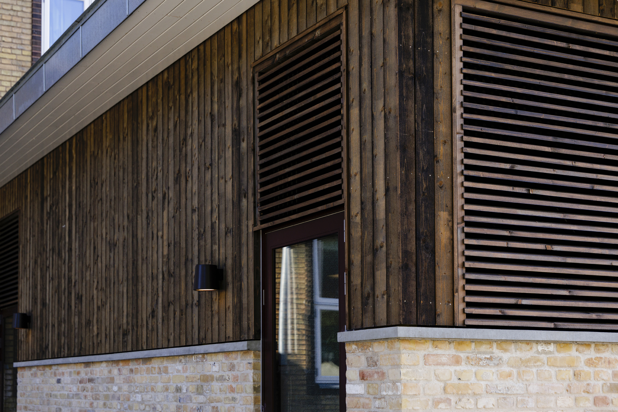 Træbeklædning og lameller er udført af overskudstræ fra træproduktion.