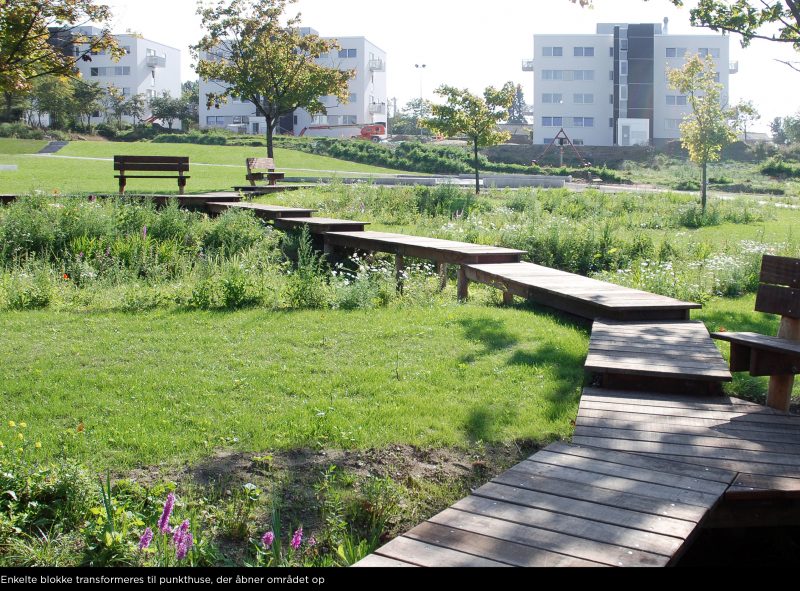 De monotone boligblokke har fået forskellig arkitektonisk identitet gennem varierede facader. De fælles gårdha-ver skaber et bolignært socialt fællesskab mellem blokkene to og to, mens det grønne parkstrøg er inviterende, aktivt og oplevelsesrigt for både beboere og besøgende.
