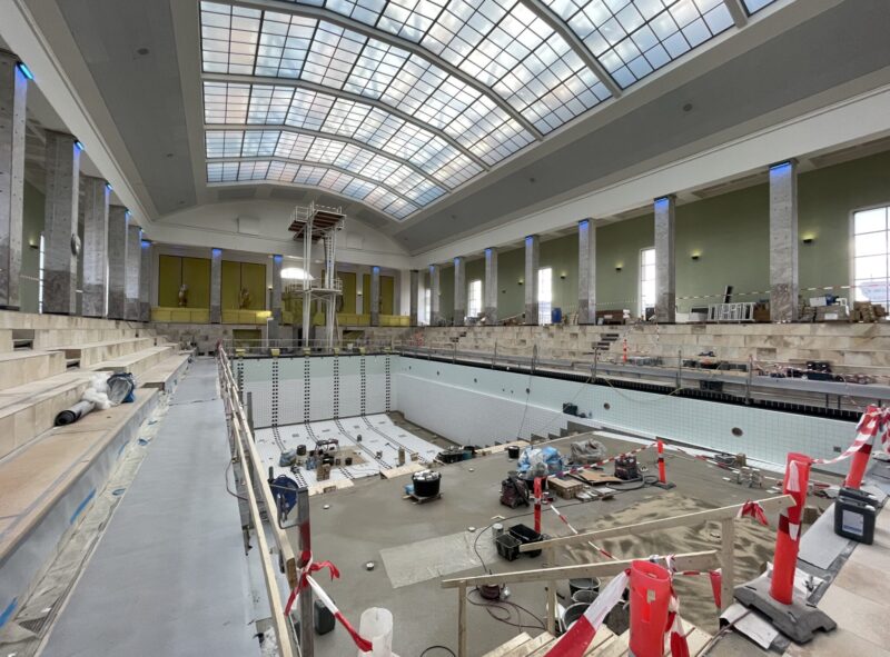 Den indvendige renovering fokuserede på promenaderne og bassinet, hvor tidligere anvendte naturstensfliser, ad flere omgange viste sig at blive nedbrudt pga. svømmehalsklimaet.