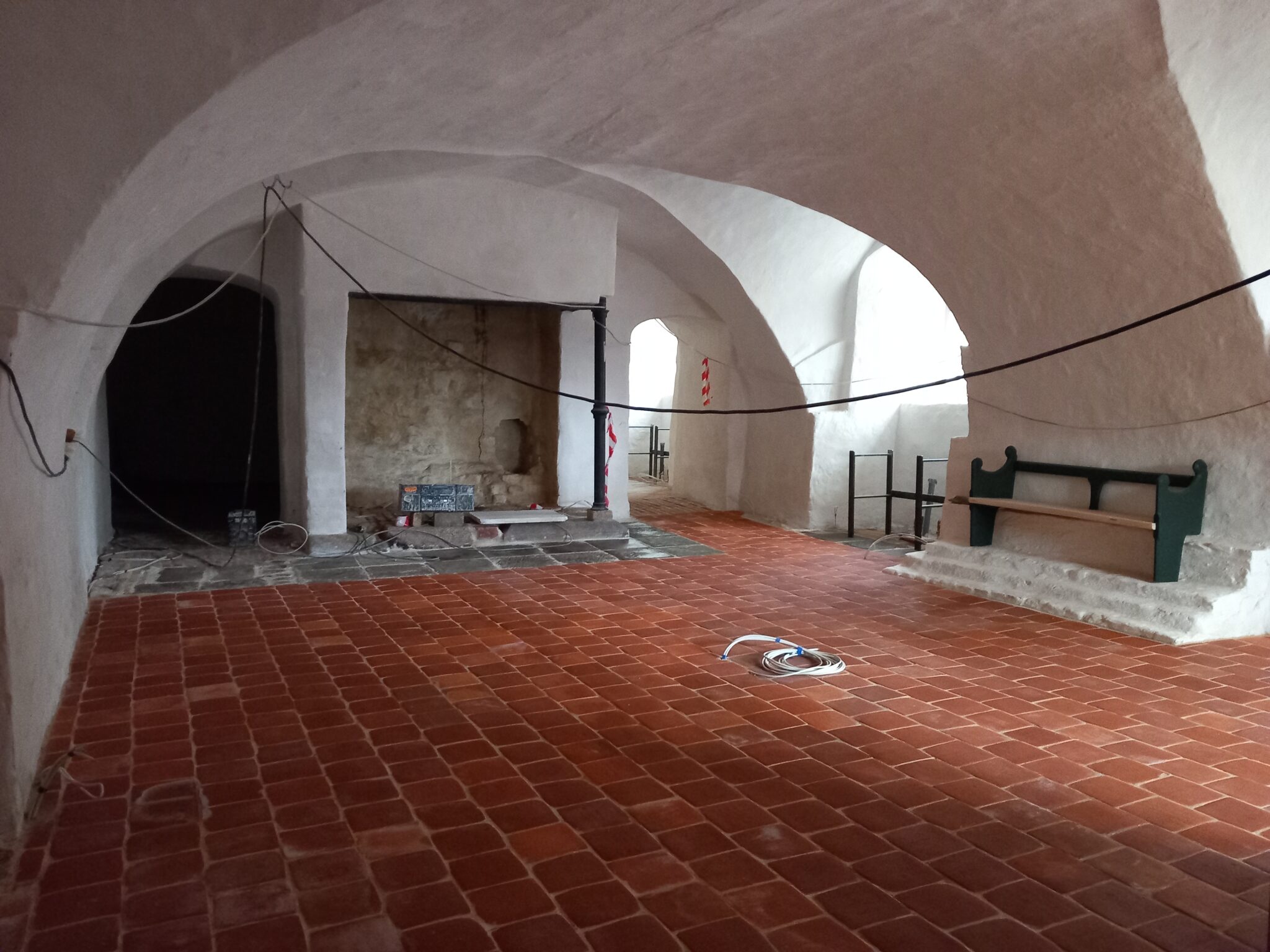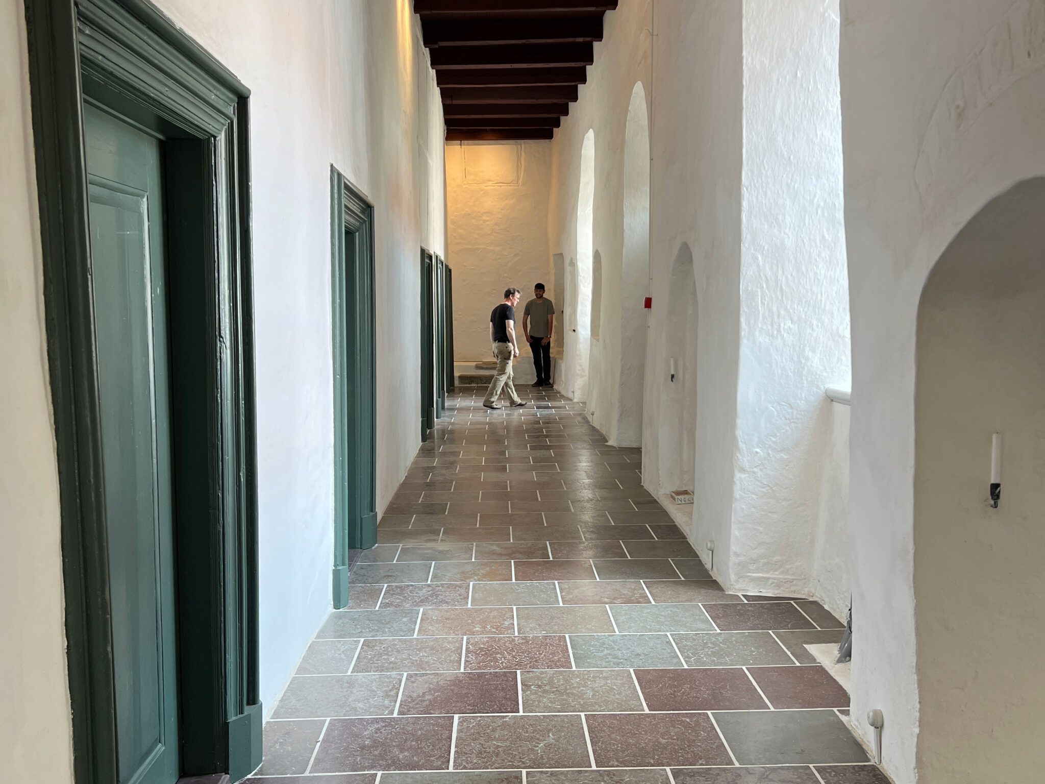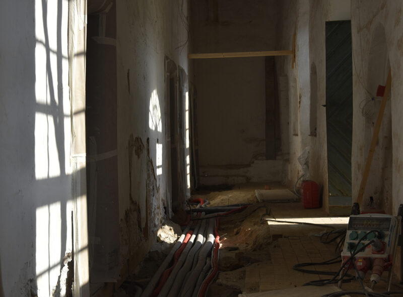 - Helhedstilgangen til arbejdet med klosteranlægget gjorde det muligt at opgradere infrastrukturen med el, vand, kloak, vvs og varme. På baggrund af vores vidensgrundlag og nøje kendskab til bygningerne kunne rør føres ind i og rundt i huset og fordeles uden at nedbryde bærende fredningsværdier. Et eksisterende hul i soklen, nedlagte skorstene, og eksisterende rørgennembrug gjorde det muligt at føre ledningsnettet rundt i anlægget, og med opsætning af nye brystningspaneler på værelserne kunne vi opfylde nutidens krav til el uden at rille i væggene. Utilpassede gulve af dårlige kvalitet fra 1934-1969 blev erstattet af kvalitetsgulve i hele længder og faldende bredder samt ølandsfliser. Derved kunne vi få efterisoleret og sikre en nutidig varmekomfort i alle rum. På fællesarealer er der anlagt gulvvarme og på værelserne er de gamle støbejernsradiatorer istandsat og genanvendt, og der er i alle vinduesnicher dannet podier med varme under, så kuldebroerne er eliminerede og komforten kraftigt forbedret.