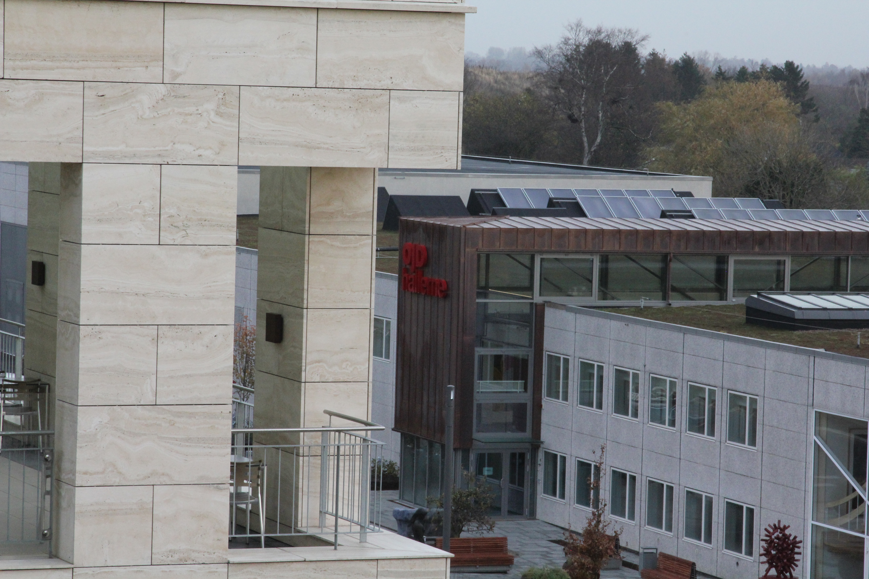 Tagfladerne er belagt med vegetation og solfangeranlæg forsyner bygningerne med varmt vand.