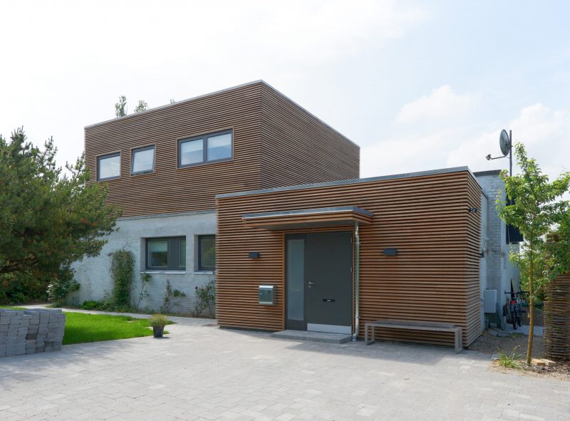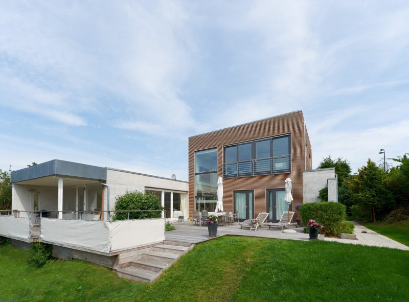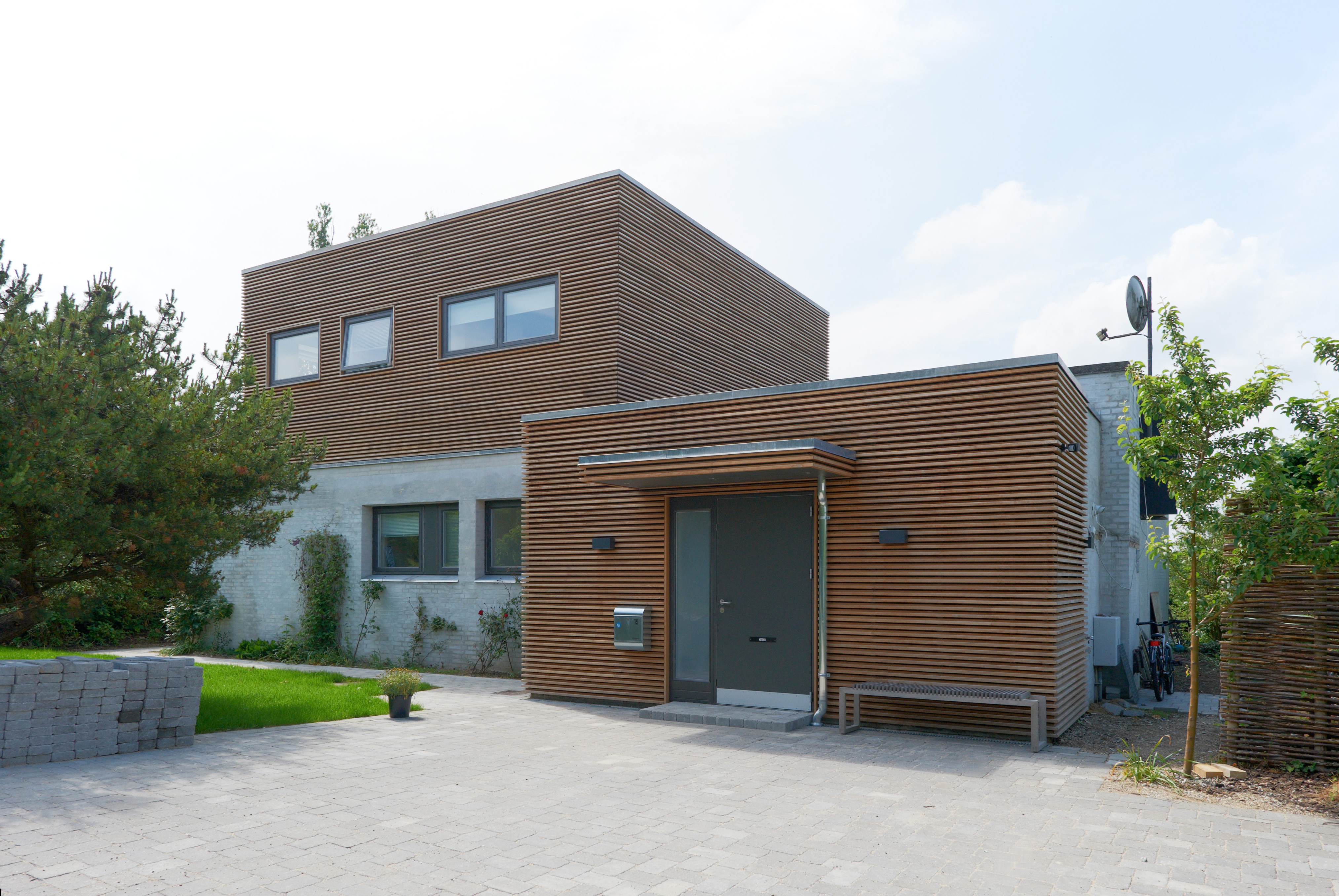 Husets arkitektoniske udtryk fremstår nu harmonisk i samspillet mellem den pudsede murstensfacade og de teaktræsbeklædte facader.
