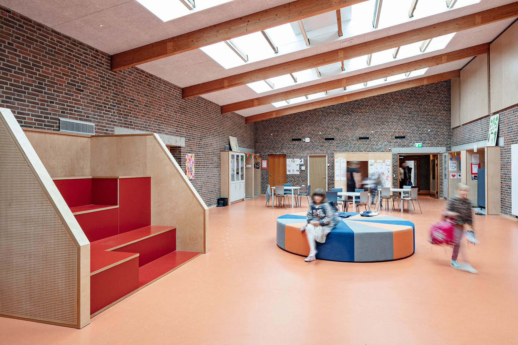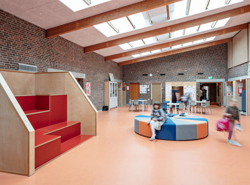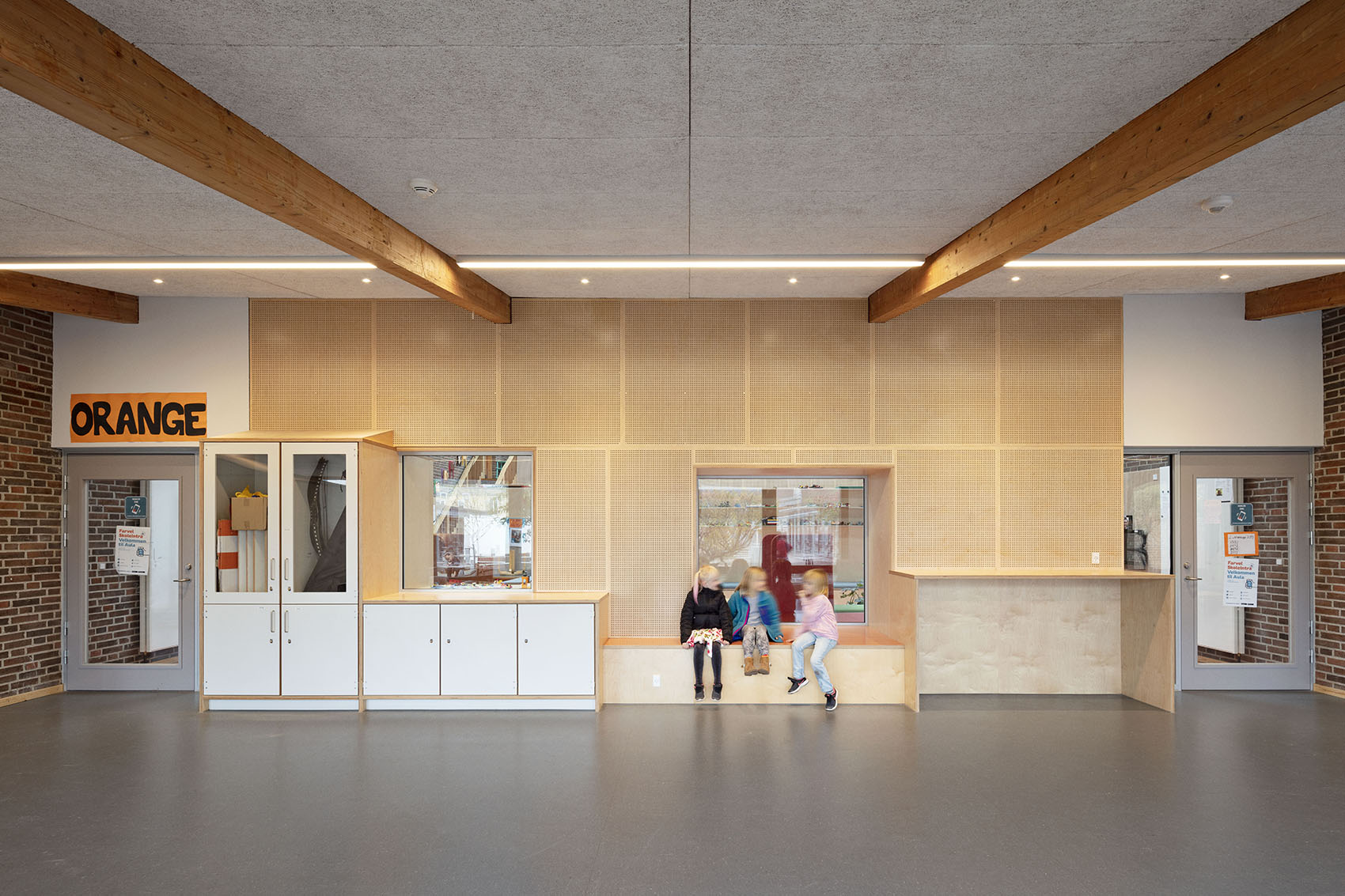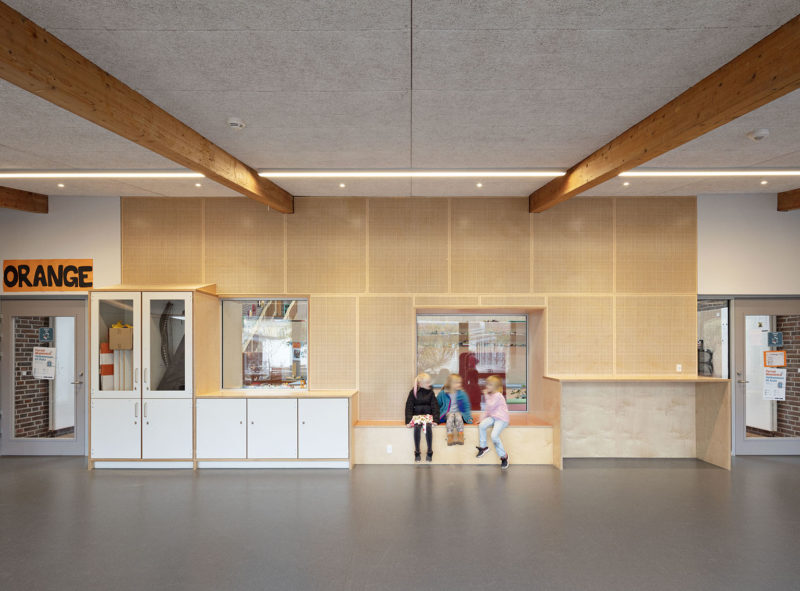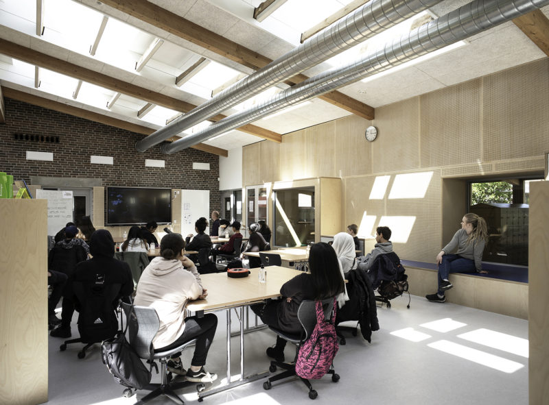 Peder Lykke Skolen er opført som en åben-plan skole, opført uden døre mellem klasselokaler og fællesarealer. De fine pædagogiske principper fra 70’erne har skolen holdt fast i. Støj har dog været en udfordring i alle årene, så i dørhullerne har vi udført ‘lydsluser’, der reducerer lydtransmission, men som også giver fysisk afstand mellem basislokaler og fællesrum. Samtidig integrerer lydsluserne det øvrige faste inventar i basislokalerne, så der er rumlig og æstetisk orden i tingene. Dette er blot et af eksemplerne på mange af de løsninger, der er anvendt for at optimere eksisterende lokaler, der i udgangspunktet har en god og robust kvalitet.