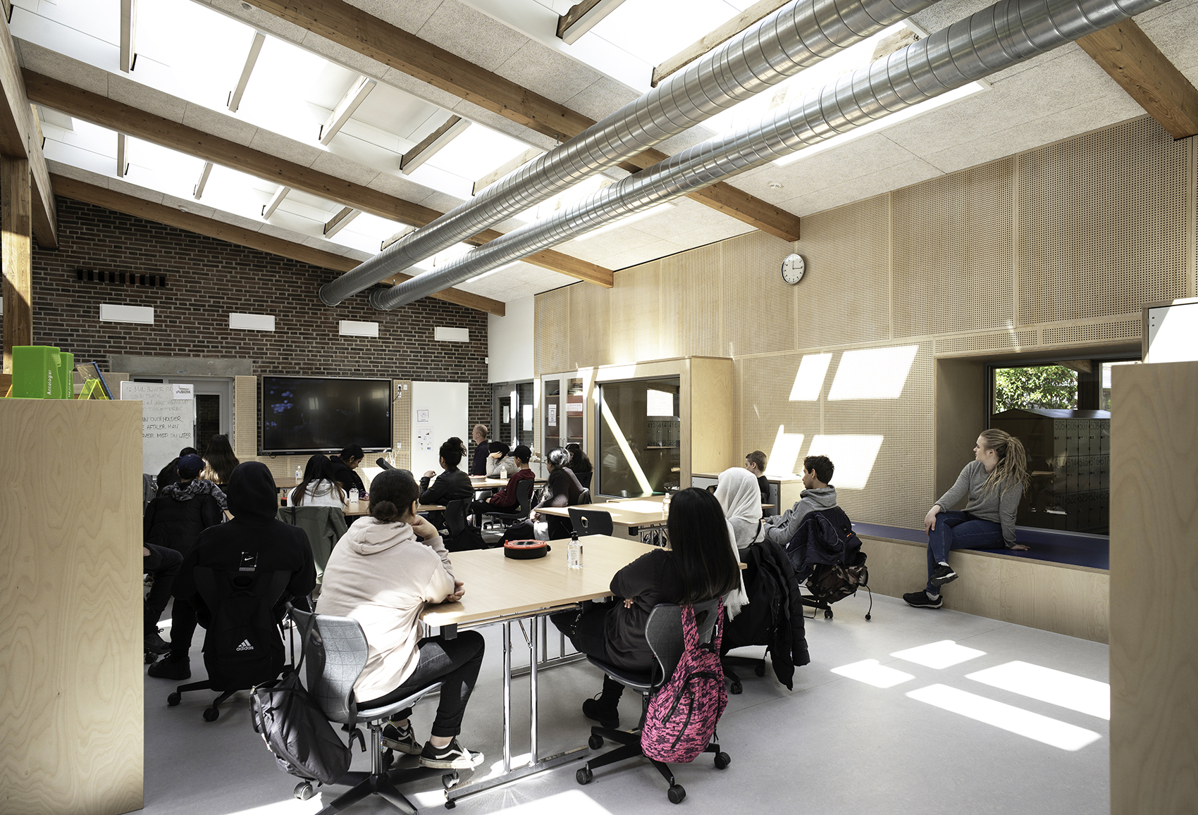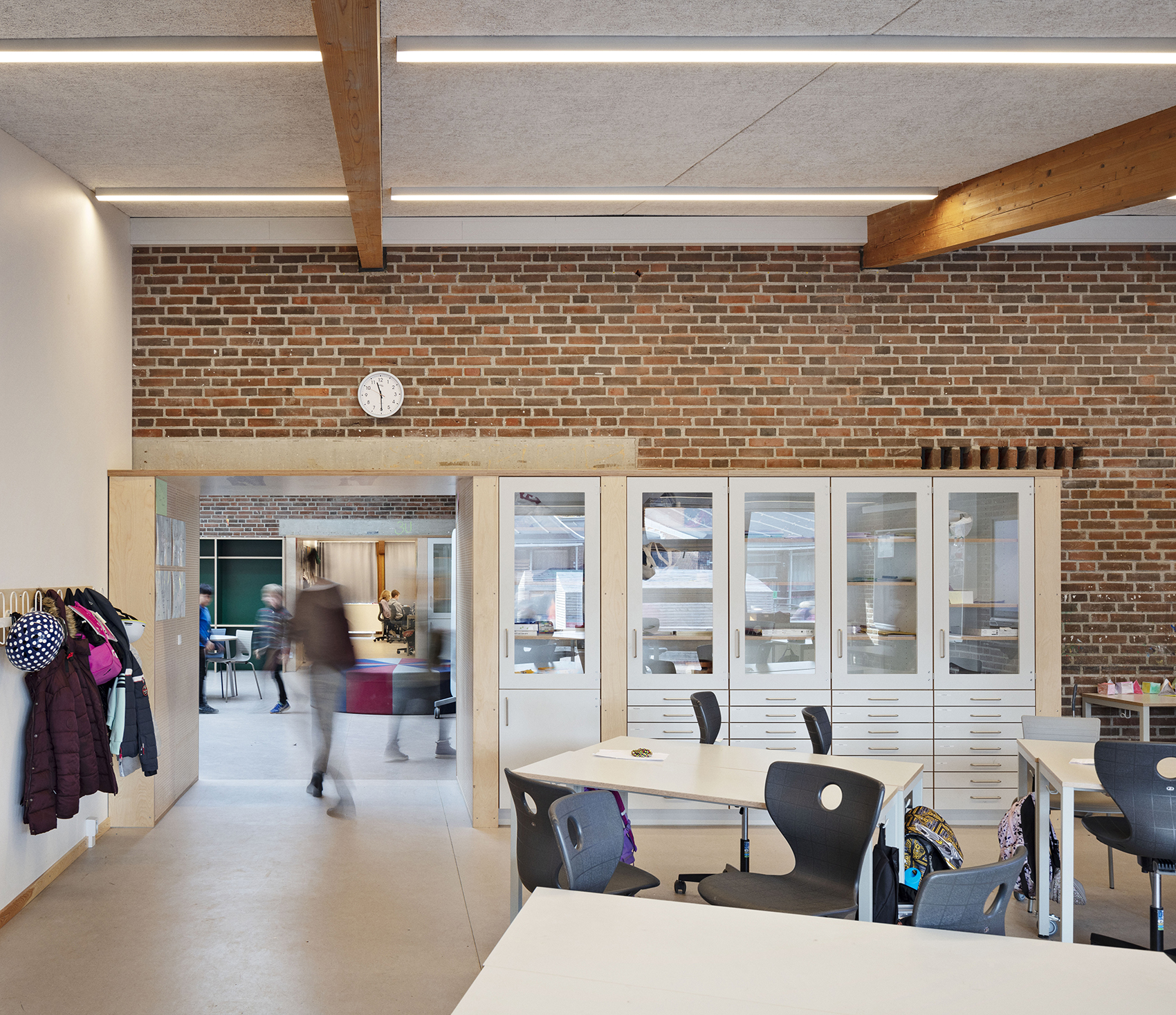 Bygningens brede forbindelsesgang er i renoveringen blevet omdannet til et aktivt område for skolens elever med indretning af garderober, opholds- og siddeområder med bænke og nicher, opbevaring og små uformelle arbejdspladser, integreret i nye ‘funktionsvægge’ mod faglokalerne.