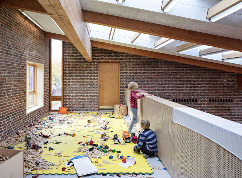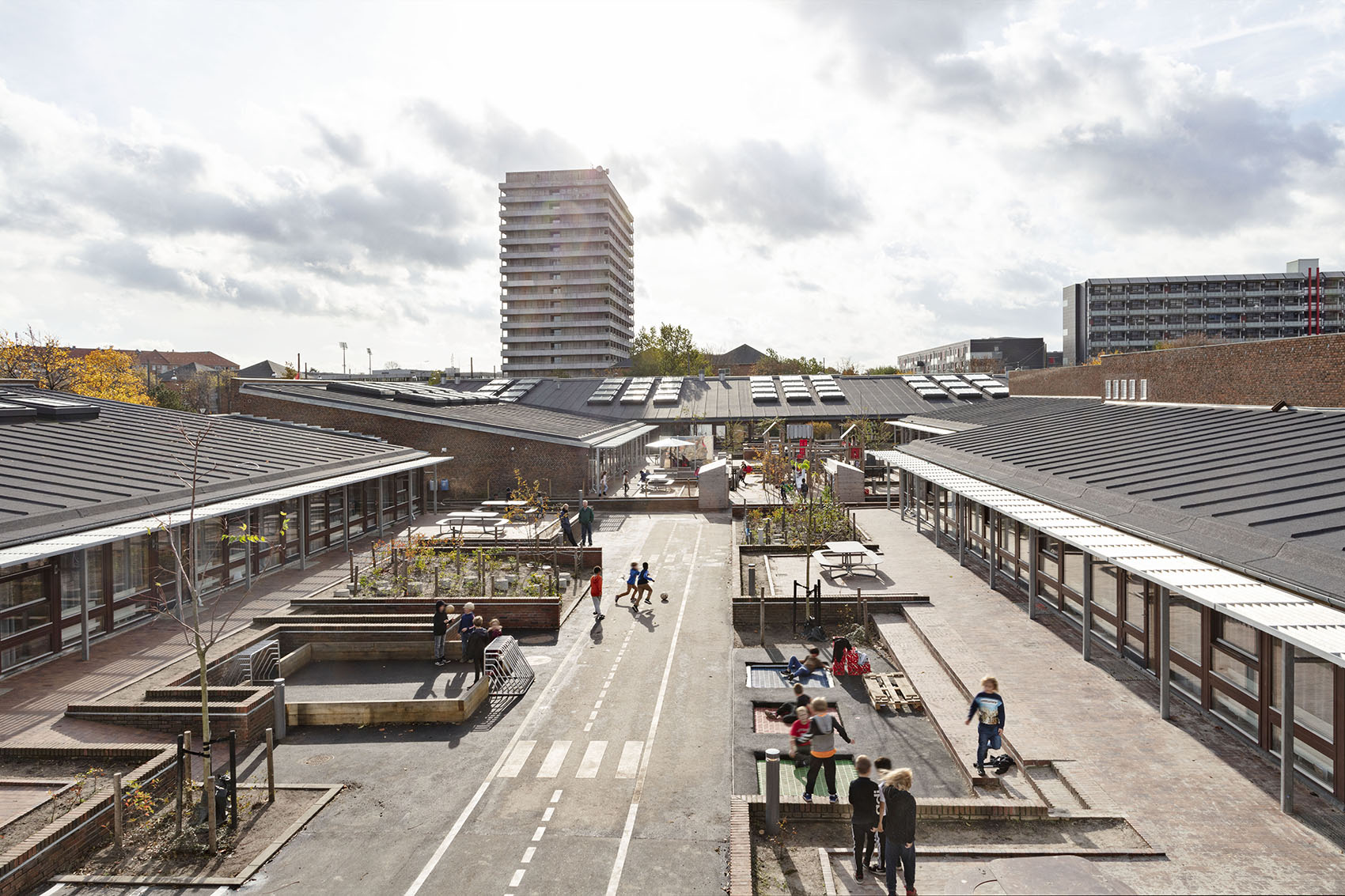Vinkelret på bygningen kobler indskoling, mellemtrin og udskoling sig på som tre selvstændige enheder med klasselokaler og et fællesområde i hver bygning. De tre fællesområder fungerer som indendørs torve, med store ovenlys der giver et smukt dagslys og indrettes forskelligt for hvert trin. Områderne indeholder en række store ’supermøbler’, der understøtter differentieret undervisning i f.eks. samlingstrapper, fordybelses-nicher og i små studiehuse med en arbejdsplads, hvor børnene kan arbejde alene eller i mindre grupper.