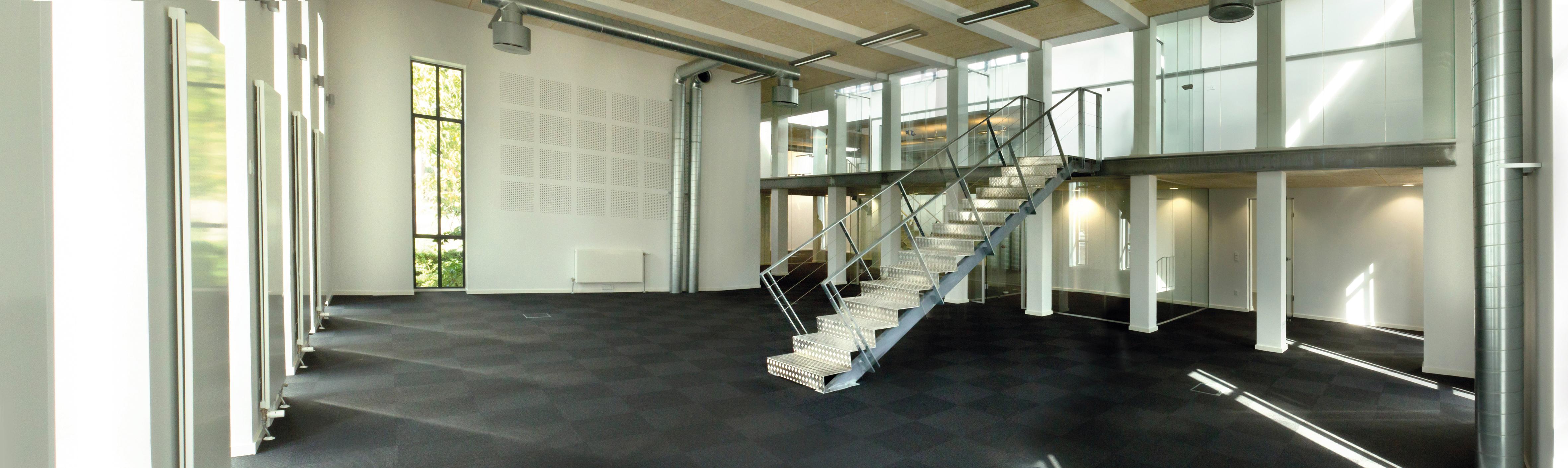 De ca. 700 m² er fordelt på kælder, stue og et nyt indskudt dæk i de meget høje rum i stueetagen.