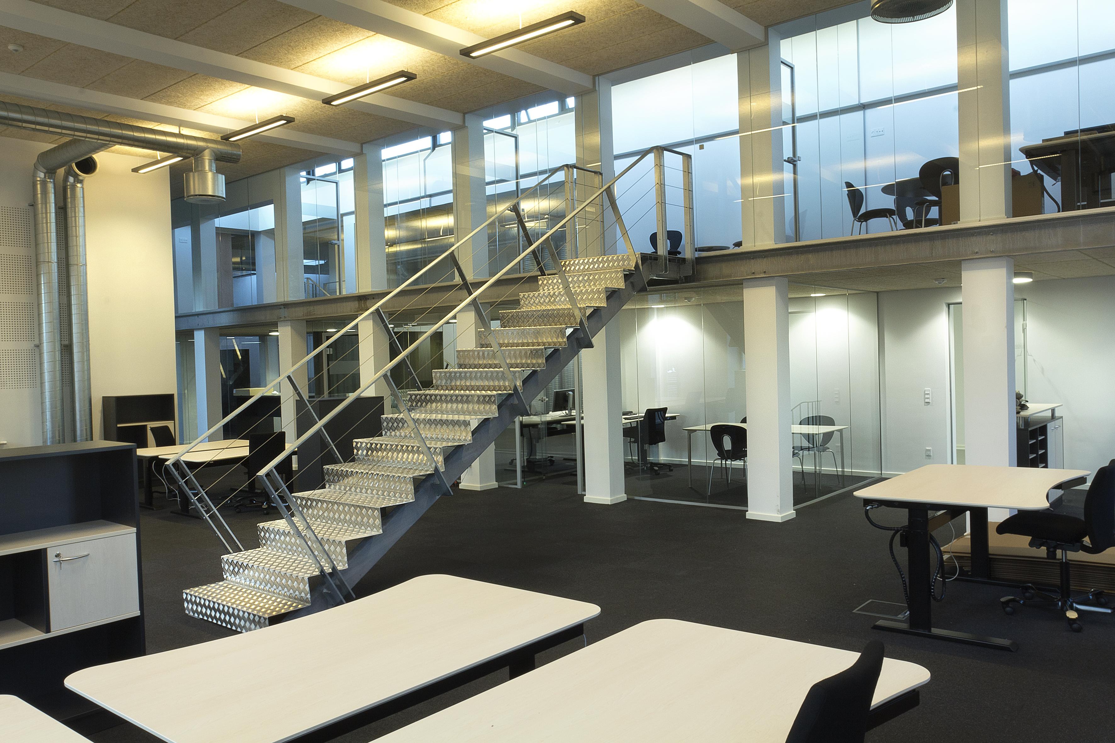 Alle kontorer, møderum og stillearbejdspladser er etableret som transparente rumligheder i glas, som sikrer gennemsigtighed og åbenhed for lejerne.