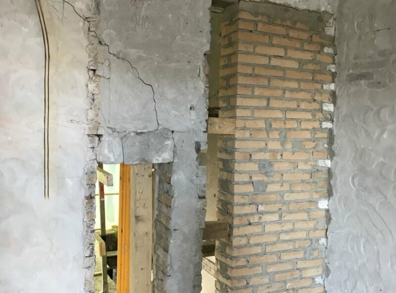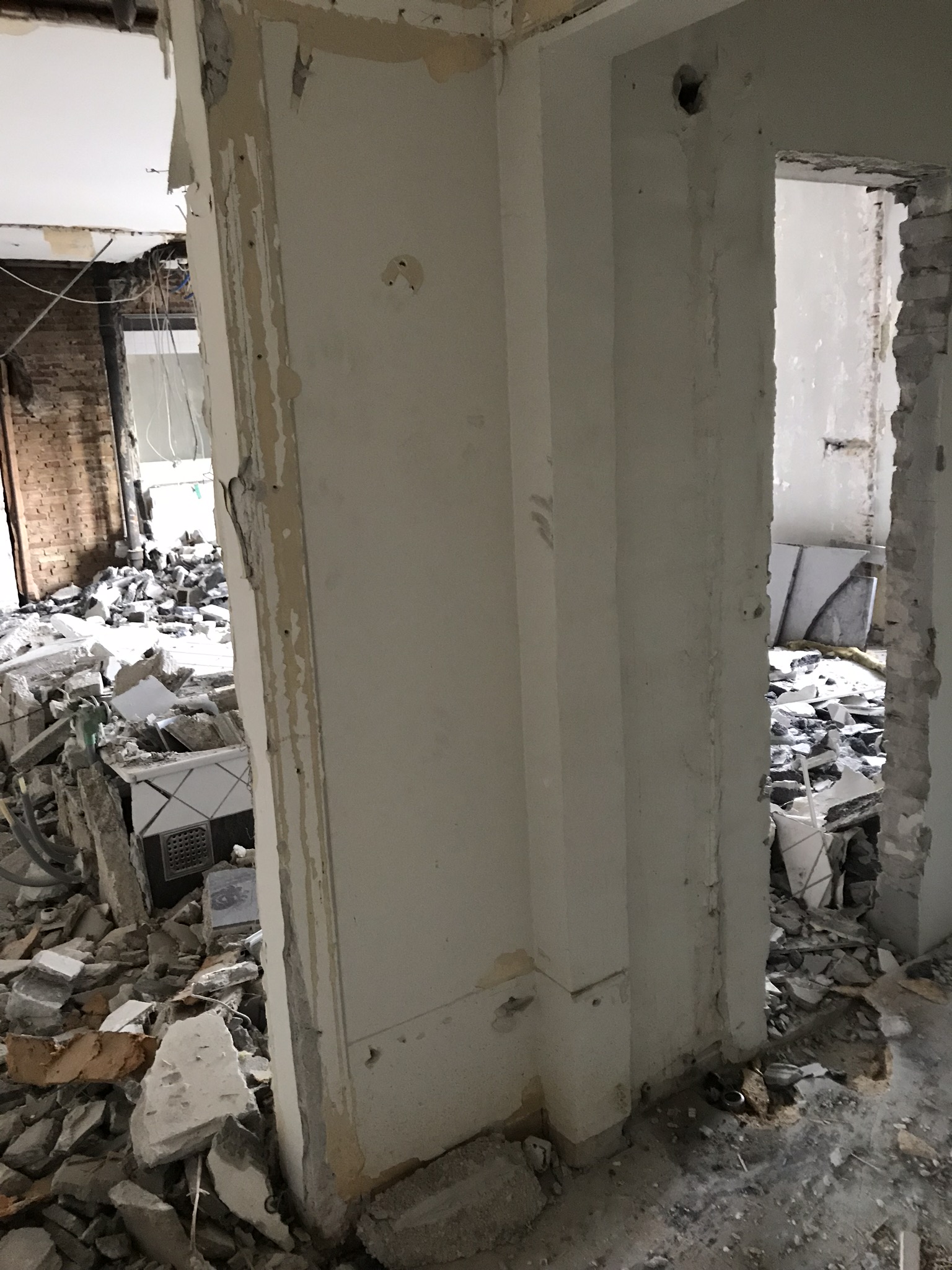 I en ende af bygningen blev en eksisterende trappeskakt nedrevet i hele bygningens højde for at give plads til bl.a. en ny, støbt elevatorskakt. Et ganske omfattende indgreb i de bestående bygningsdele.