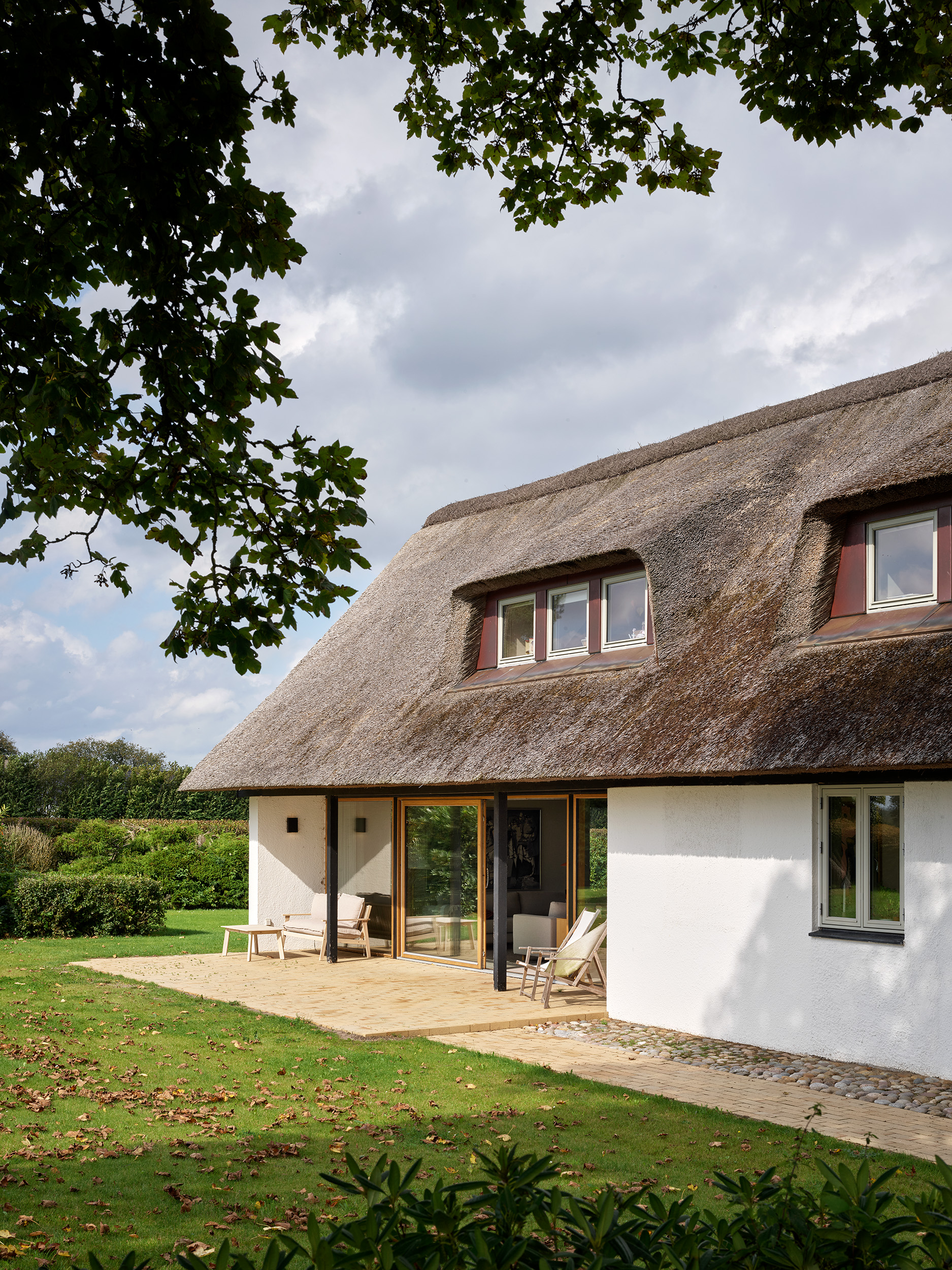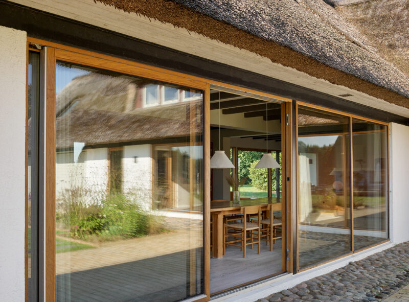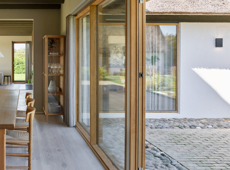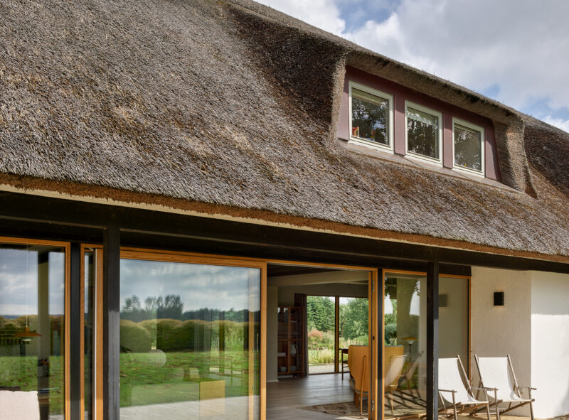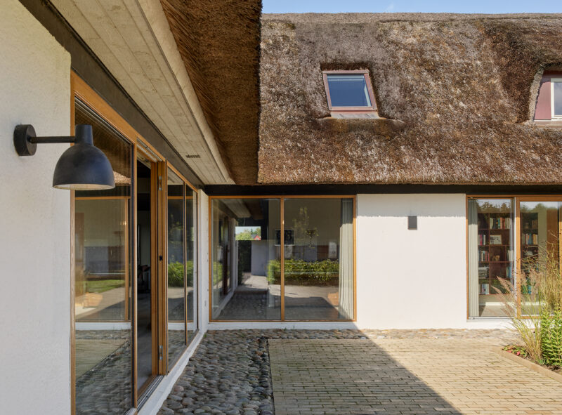 I renoveringen er eksisterende pigstensbelægninger genanvendt og minimerer forsat opsprøjt fra stråtaget på de hvidpudsede vægge. De tre elementer kan henføres til den traditionelle byggeskik på landet, og der opstår en fin forbindelse mellem fortid og fremtid, når de olierede egetræsvinduer, som spænder mellem hvide flader, skaber referencer til den særlige varme nordiske modernisme.