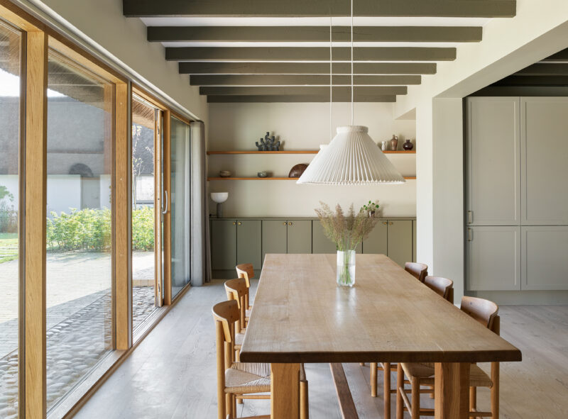 Stråtag, egetræsvinduer, douglasgulv, teglbelægninger og pigsten samler forandringerne i en stedforankret atmosfærefuld helhed, som fremstår med integritet – hvor logik og æstetik er forenet.