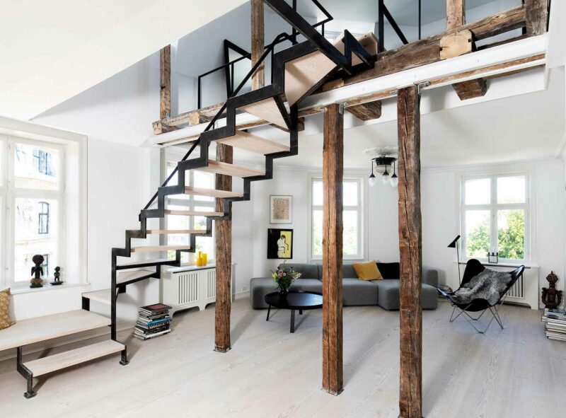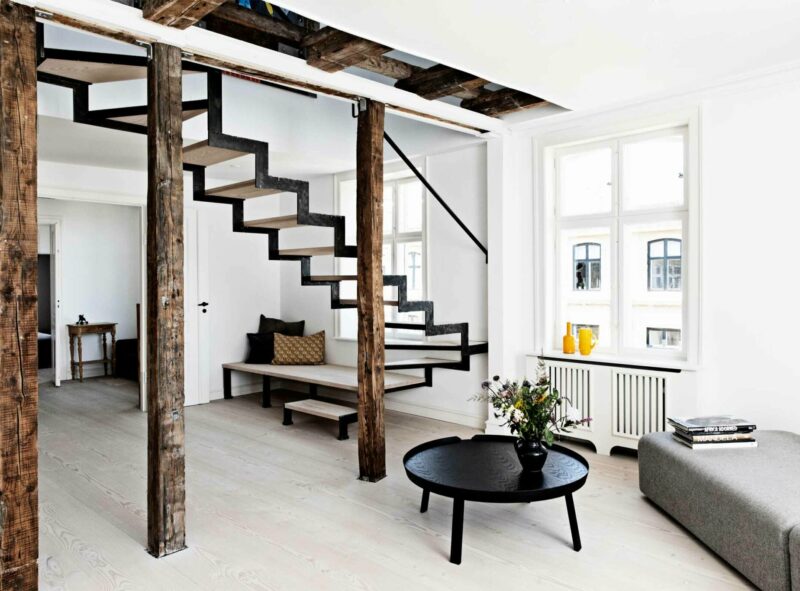 Hertil kommer det gamle loftrum også i spil, med et ekstra stort dobbelthøjt rum, der åbner stuen op og giver lyset lov til at strømme ned fra oven og sprede sig ud i resten af lejligheden. Loftrummet bliver naturligt forbundet gennem en enkel og skulpturel trappe der ubesværet fletter sig ind i skoven af søjler og går endda ud og slutter sig til detaljen i værnet.