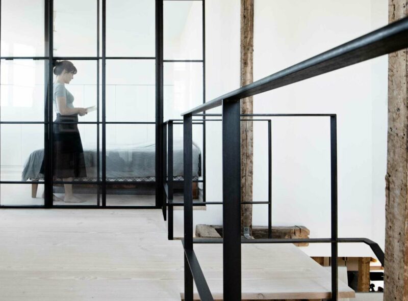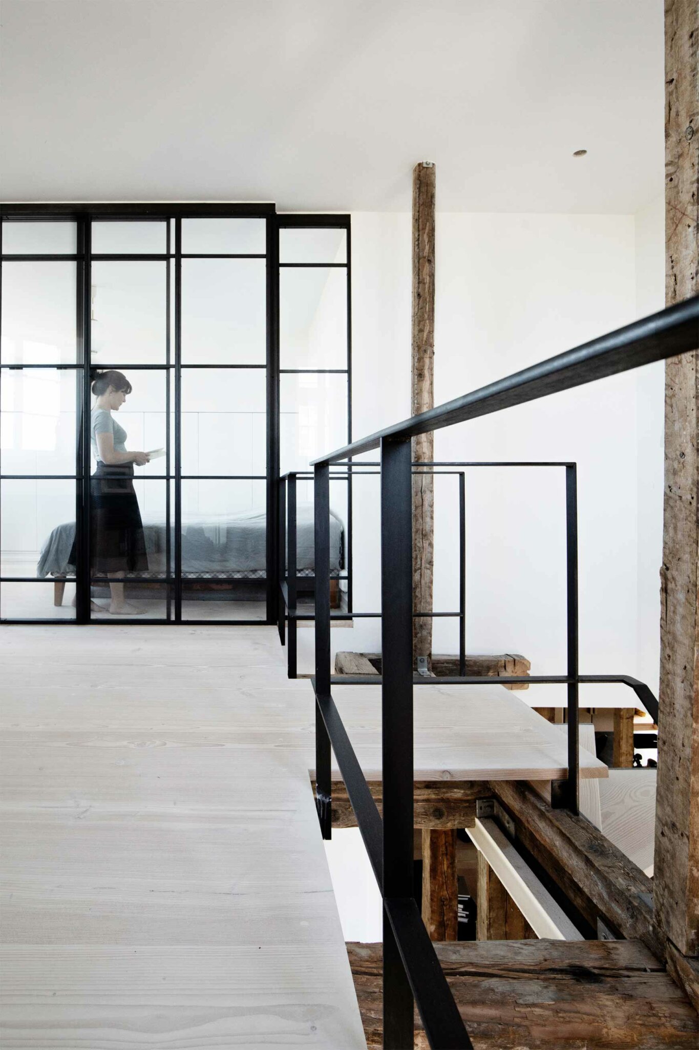 Det var vigtigt at trappen blev en forlængelse af rummene og derfor har man også som en betydelig detalje foldet det første trin ud til en bænk. Dermed bliver trappen med sin utraditionelle og funktionelle detalje, mere end bare et gennemgangselement. Den bliver også et grafisk smukt møbel, som med kombinationen af sit rå smedejern som kant og det bløde, varme dinesengulv som trædepude, inviter til en sanselig og rolig oplevelse.