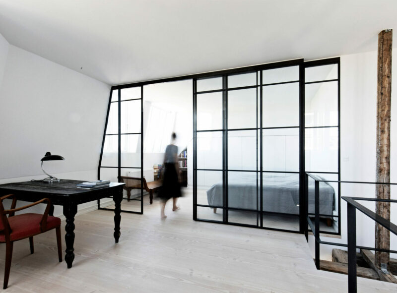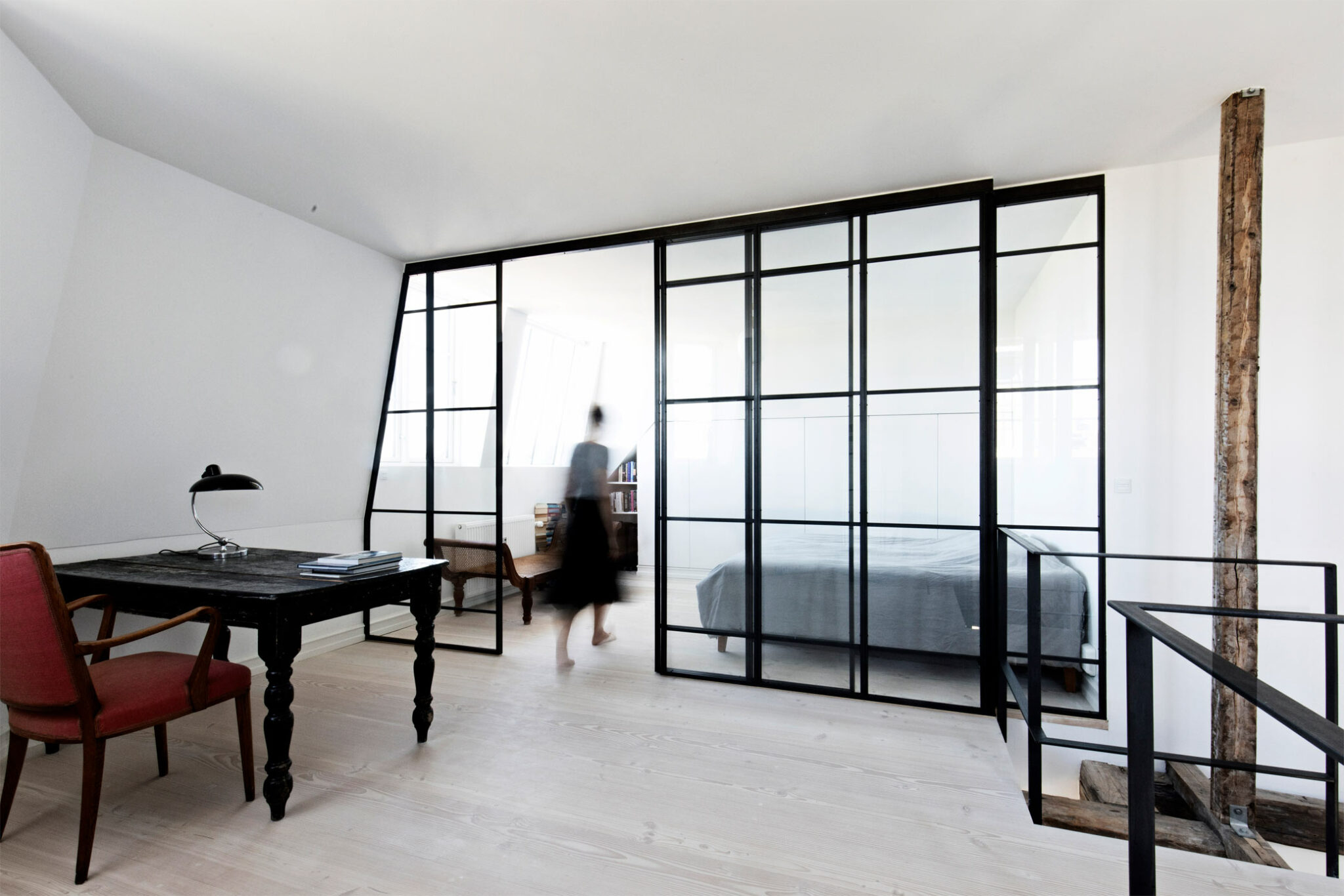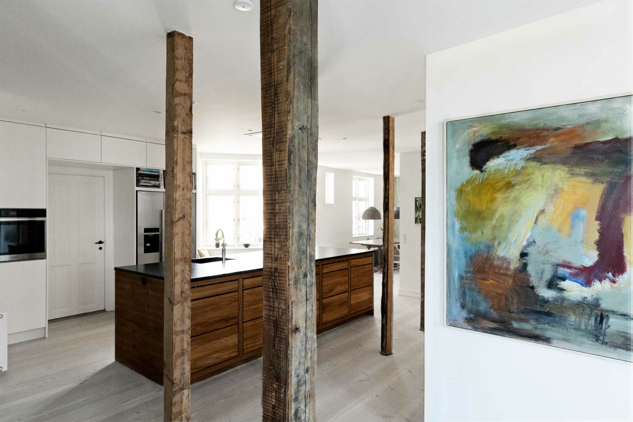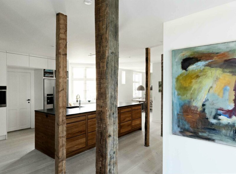 Med et ønske om at åbne op, bringe lys igennem rummene samt inddrage loftrummet på en naturlig måde, kom visionen til at fremstå tydeligt for hvordan renoveringen skulle gribes an. Ved at nedlægge den smalle fordelingsgang og skrælle det helt ned til lejlighedens skelet, står den oprindelige bindingsværkskontruktion tilbage som et fremherskende arkitektionkisk element, der åbner lejligheden op på tværs med gennemtrængende lys fra alle sider. Dette greb giver bindingsværksstolperne lov til at stå rå og enkle i deres originalitet, og bliver det, der både forbinder og inddeler fællesarealerne.