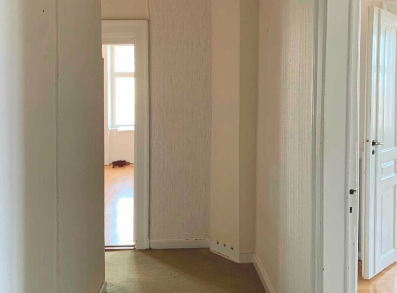 Hovedtrappen fra opgangen, fører op til herskabslejlighedens entré, hvor man engang blev mødt af en fordelingsgang, der meget markant, opdelte lejligheden og dets rum omkring sig. Fordelingsgangen var lejlighedens svage punkt, da den fungerede som en barrier for en ellers ekseptionel udsigt over Købehavn samt et lysmæssigt potentiale fra de sydvendte stuer.