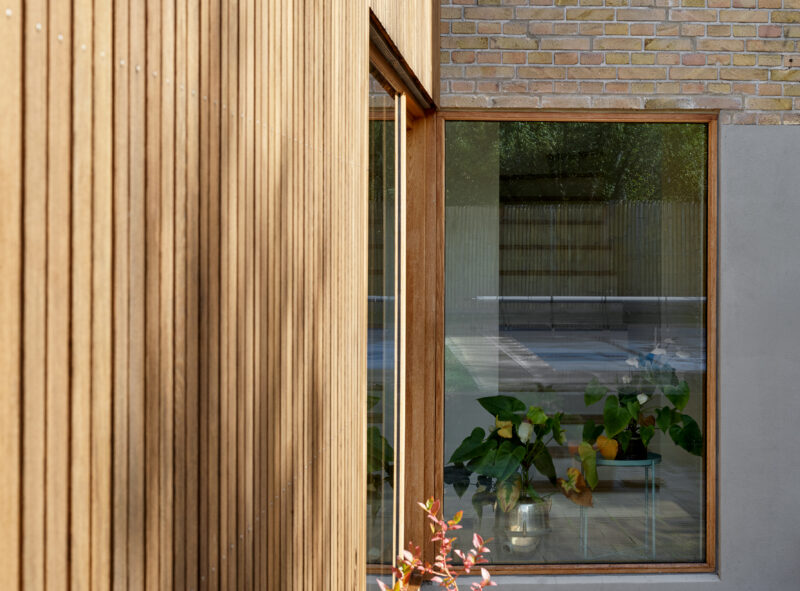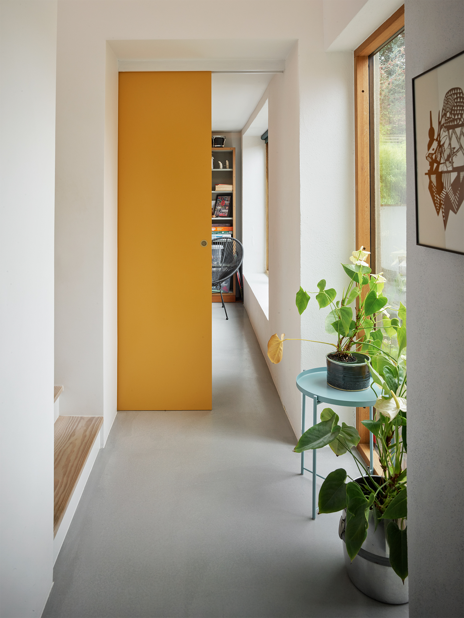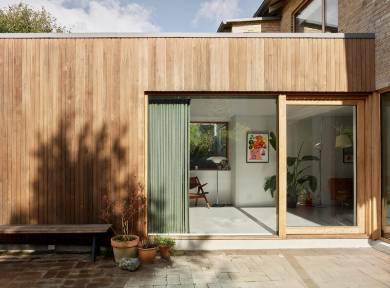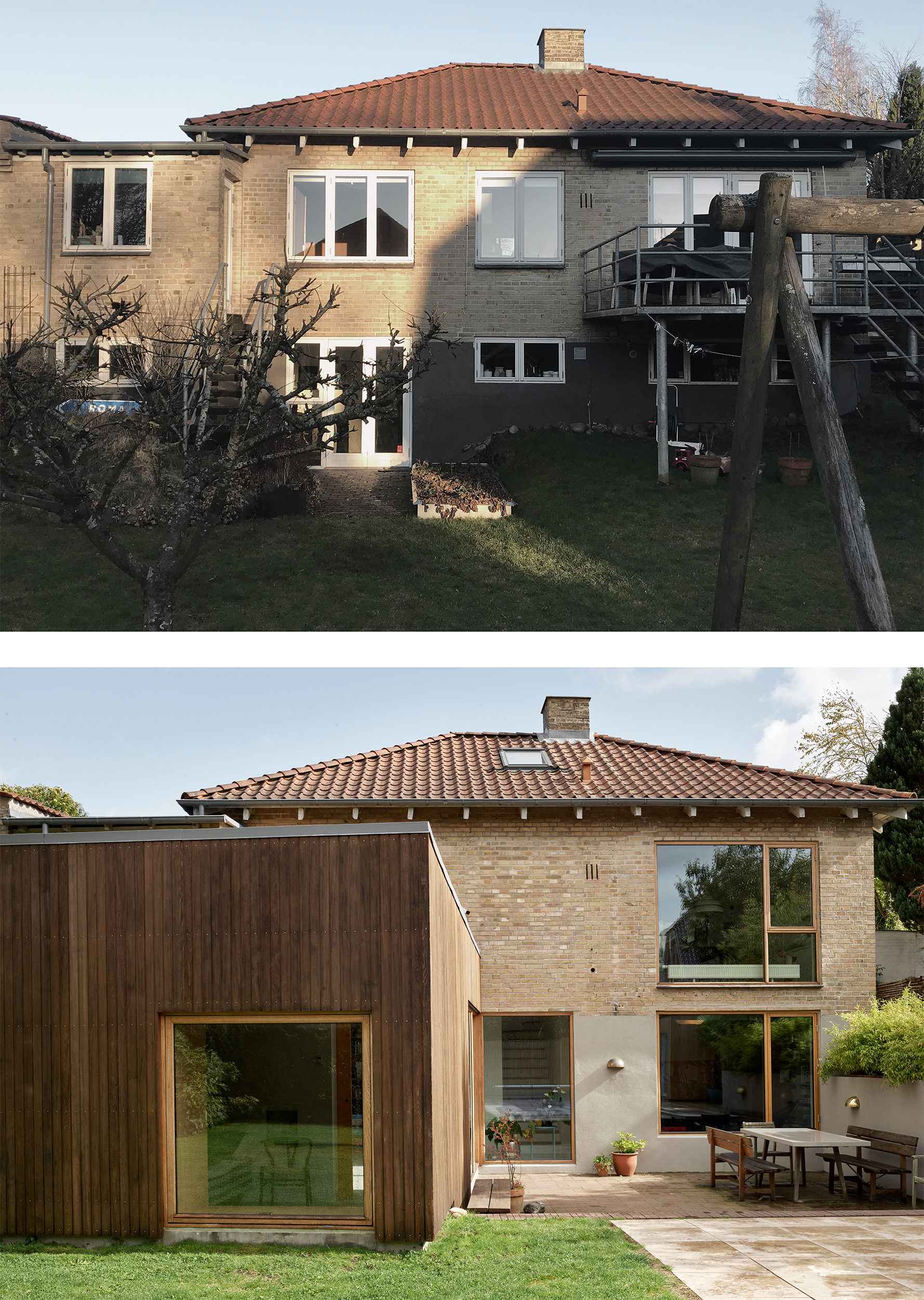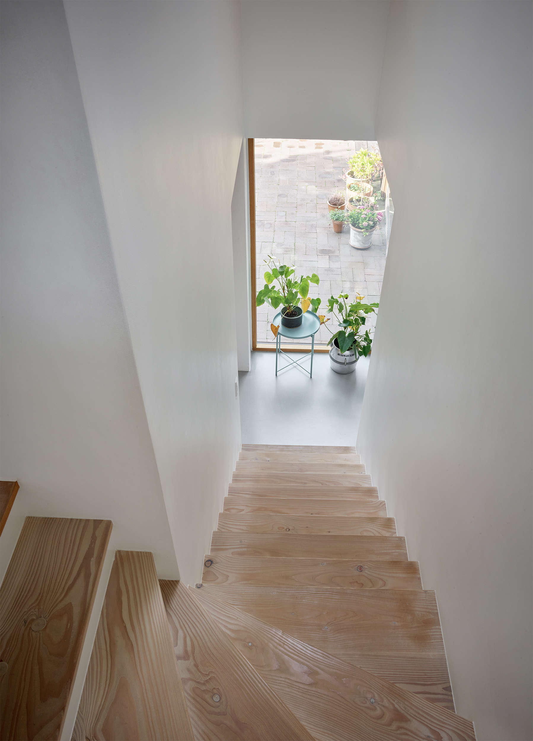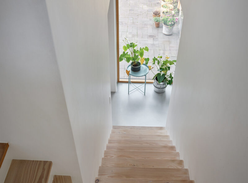 Særligt tilføjelsen af trappen, som styrker forbindelsen til det nedre plan og haven, har forandret husets brugsværdi og bidrager til de rumlige oplevelser. Den oprindelige kælderetage mod haven fremstår nu som en fortsættelse af boligen, hvor omdannelse af eksisterende har gjort det muligt at skabe funktionelle løsninger med æstetiske kvaliteter, ved tilføjelse af minimal tilbygning, som bringer det samlede boligareal på 124 m².