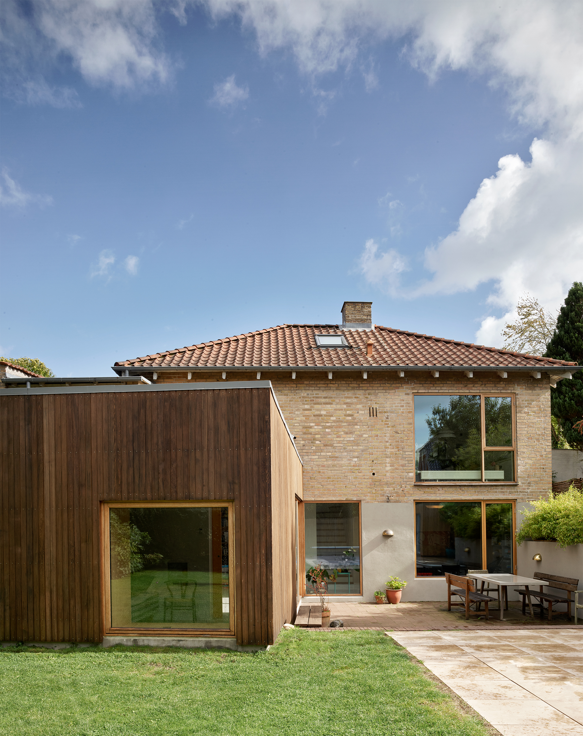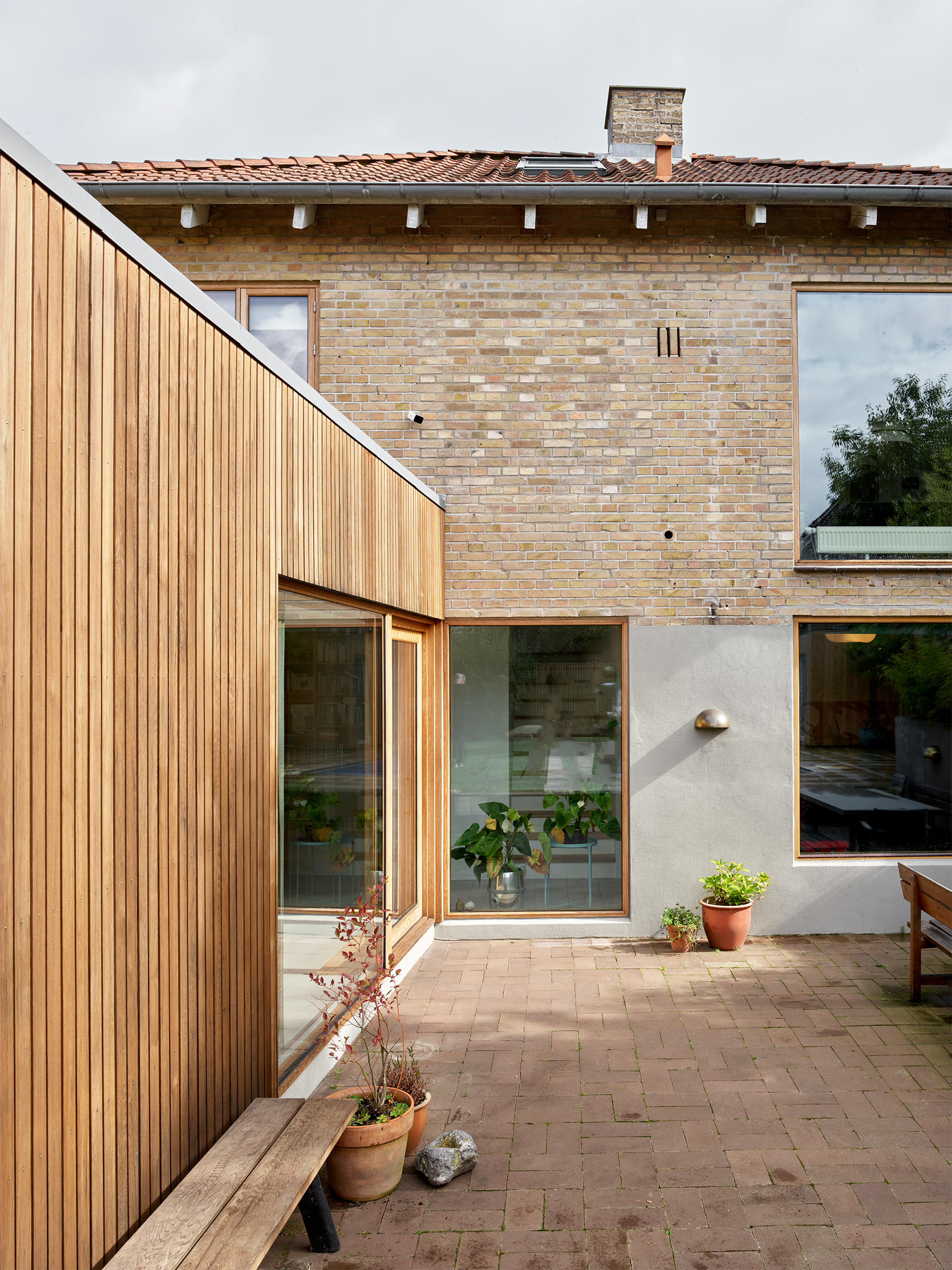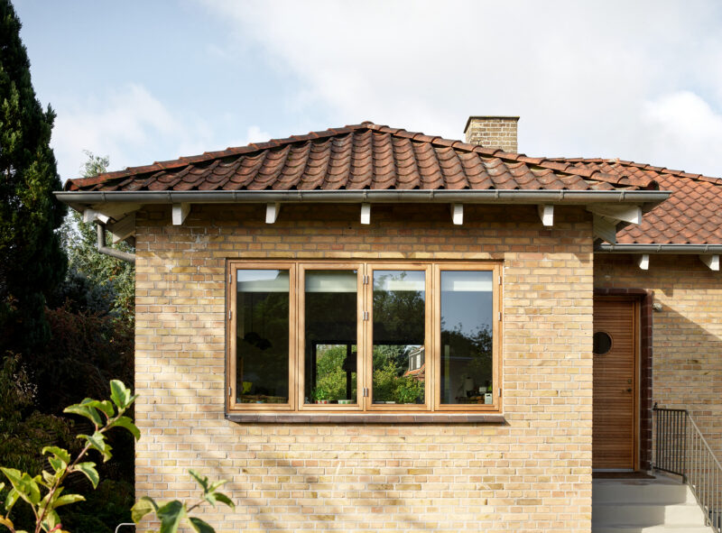Afstemt materialeholdning båret af naturmaterialer og kontekstbaserede traditionelle løsninger bidrager til styrkelse af husets integritet og oprindelige karakter. Den store virkning har afsæt i et mindre indgreb, hvor egetræsvinduer bringer det varmeste frem i de eksisterende teglsten og forskønner kompositionen ved nedtoning af de uændrede vinduesåbninger i facaden mod kvarterets villavej. Teglbelægninger og afstemt sokkelfarve bidrager ligeledes til den harmoniske helhed, som fremstår med styrket relation til kulturmiljøet – i gensidig påvirkning.