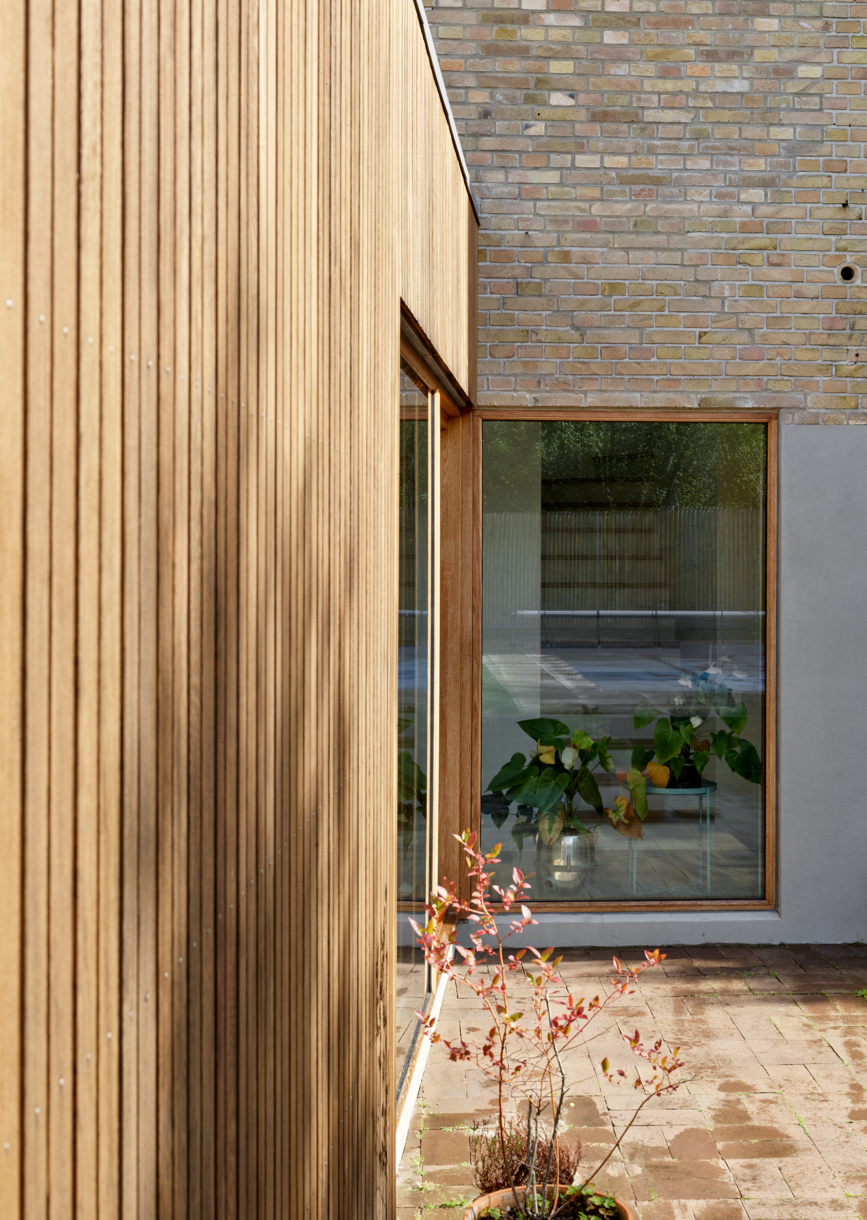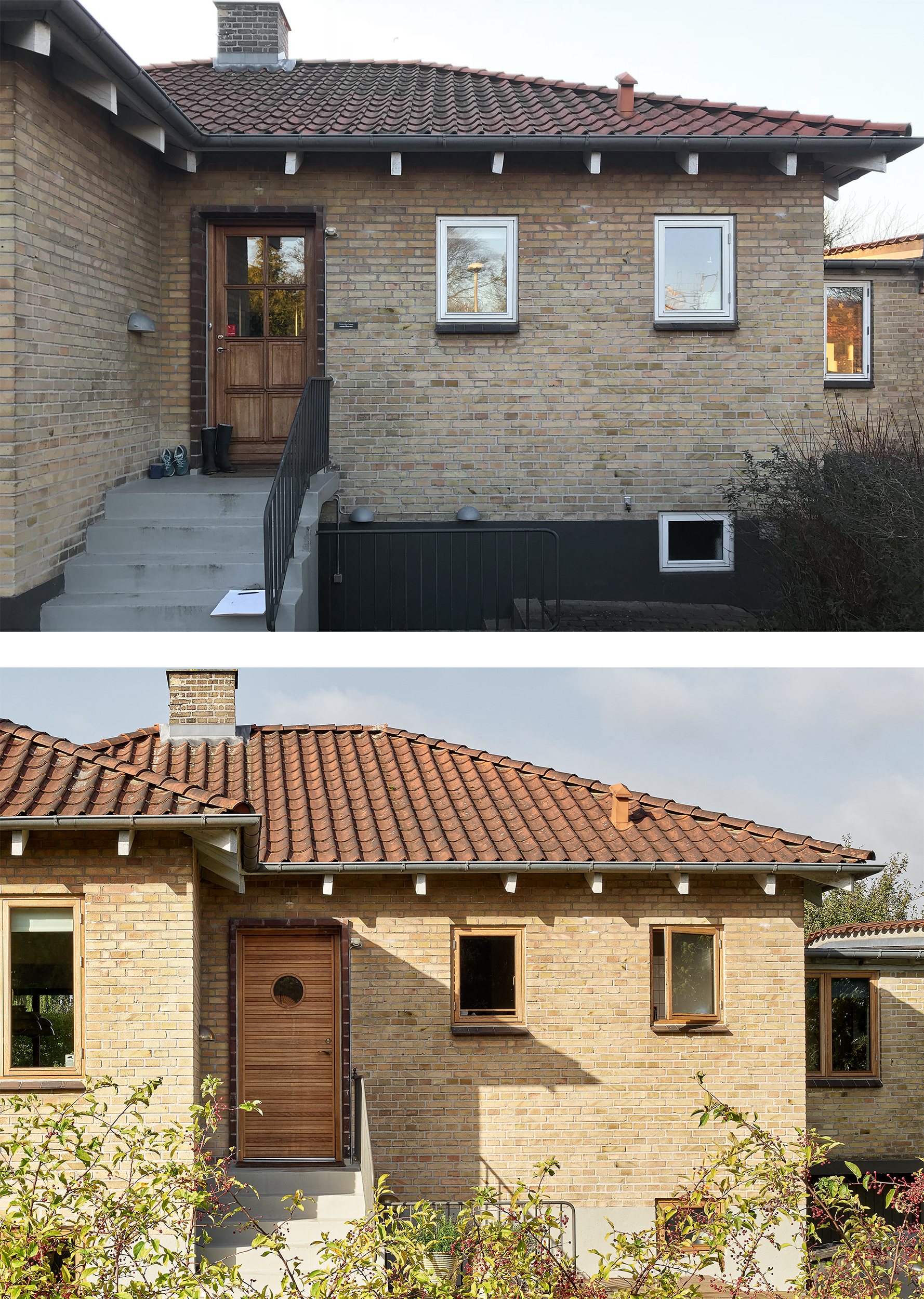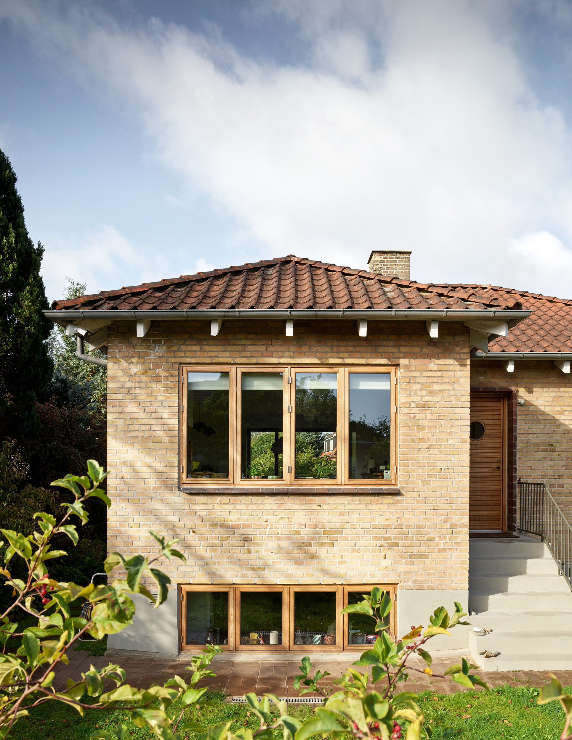 Afstemt materialeholdning båret af naturmaterialer og kontekstbaserede traditionelle løsninger bidrager til styrkelse af husets integritet og oprindelige karakter. Den store virkning har afsæt i et mindre indgreb, hvor egetræsvinduer bringer det varmeste frem i de eksisterende teglsten og forskønner kompositionen ved nedtoning af de uændrede vinduesåbninger i facaden mod kvarterets villavej. Teglbelægninger og afstemt sokkelfarve bidrager ligeledes til den harmoniske helhed, som fremstår med styrket relation til kulturmiljøet – i gensidig påvirkning.