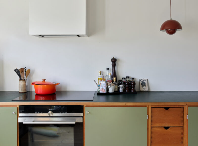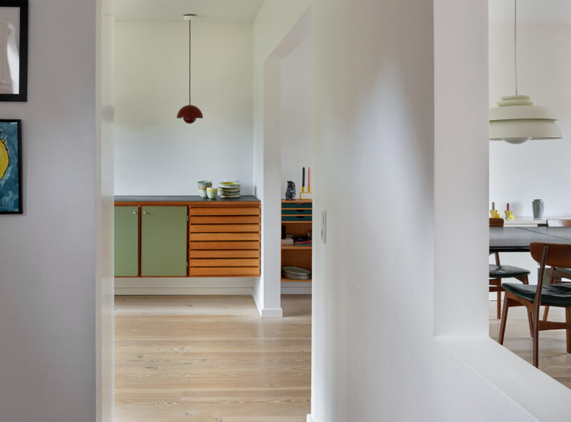 Med enkle greb som ophængning uden sokkel, tilføjelse af nye elementer og skulpturel emhætteskjuler bidrager det tidligere køkken med liv og sjæl i de nye rammer. Løsningen har i høj grad afsæt i bygherres blik for eksisterende værdier og mod til at følge deres intuition.