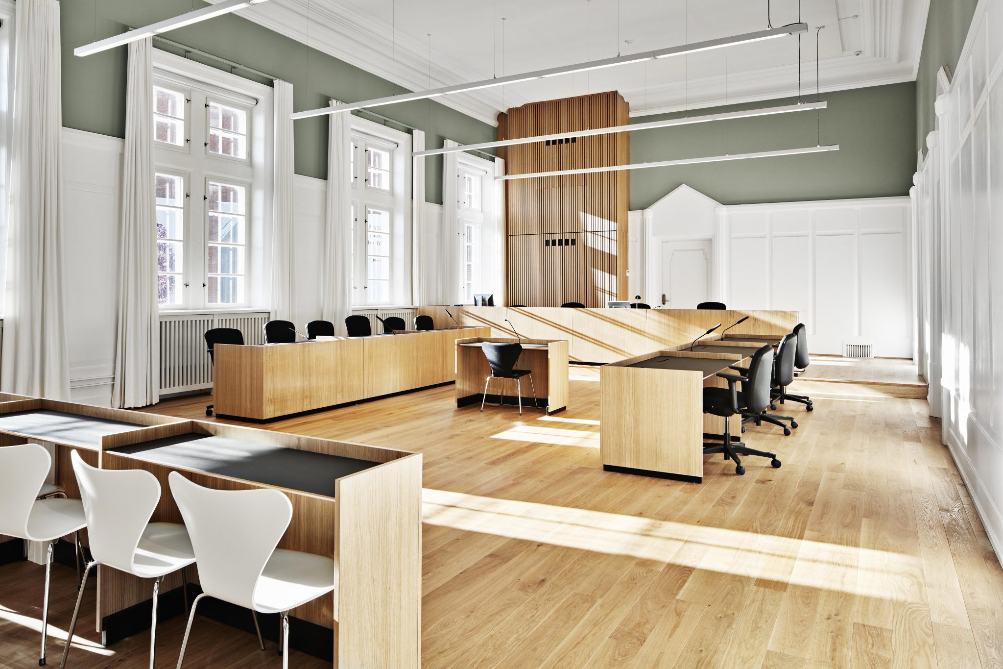 Retten i Aarhus har gennemgået en omfattende renovering i dyb respekt for det gamle hus’ sjæl og arkitektur. Det er blevet til 3.100 m² retssale med tilhørende funktioner som voteringslokaler og ventearealer og 1.000 m² kontor og administration i tagetagen, der hidtil henlå som loft og i gamle dage pigekamre til ansatte i køkkenet.