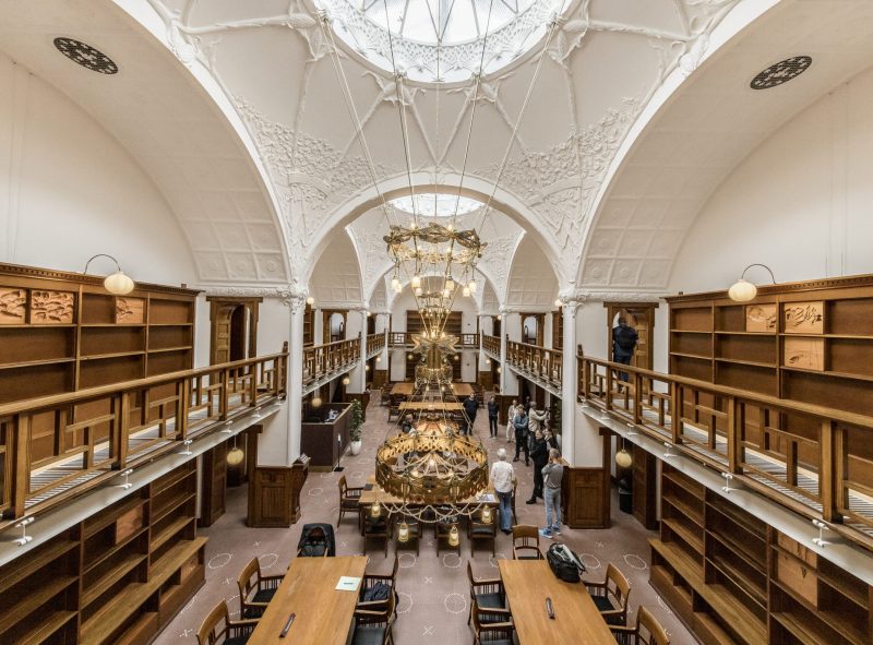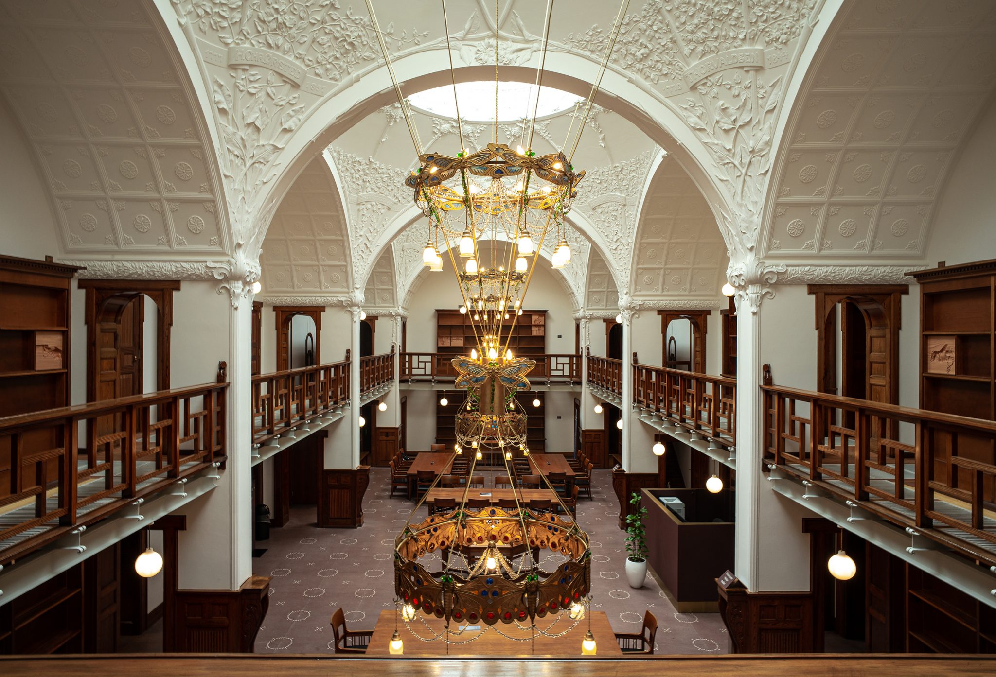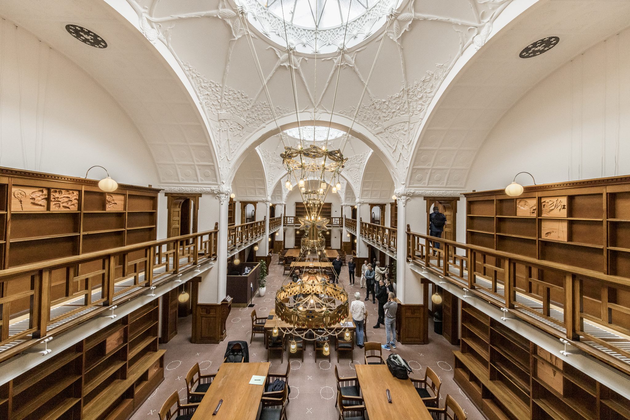 De fredede lysekroner i læsesalen er blevet renoveret. De blev skilt ad, vasket og pudset op. Lampefatningerne er blevet udskiftet, og lyskilderne er nu med LED. Der er snoet guldkabler sammen inspireret af, hvordan de oprindelige ledninger så ud.