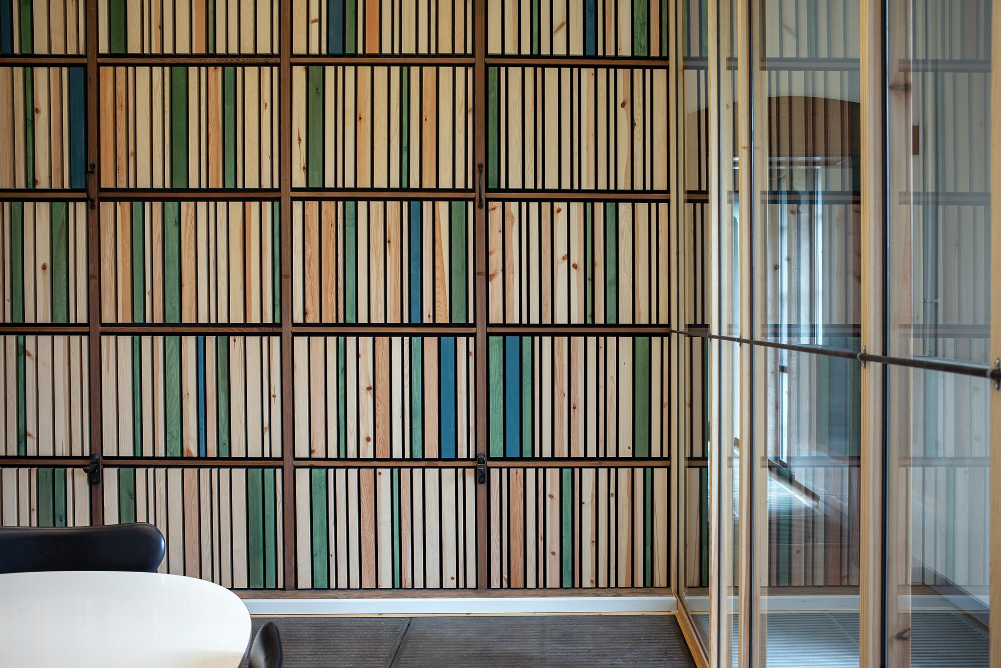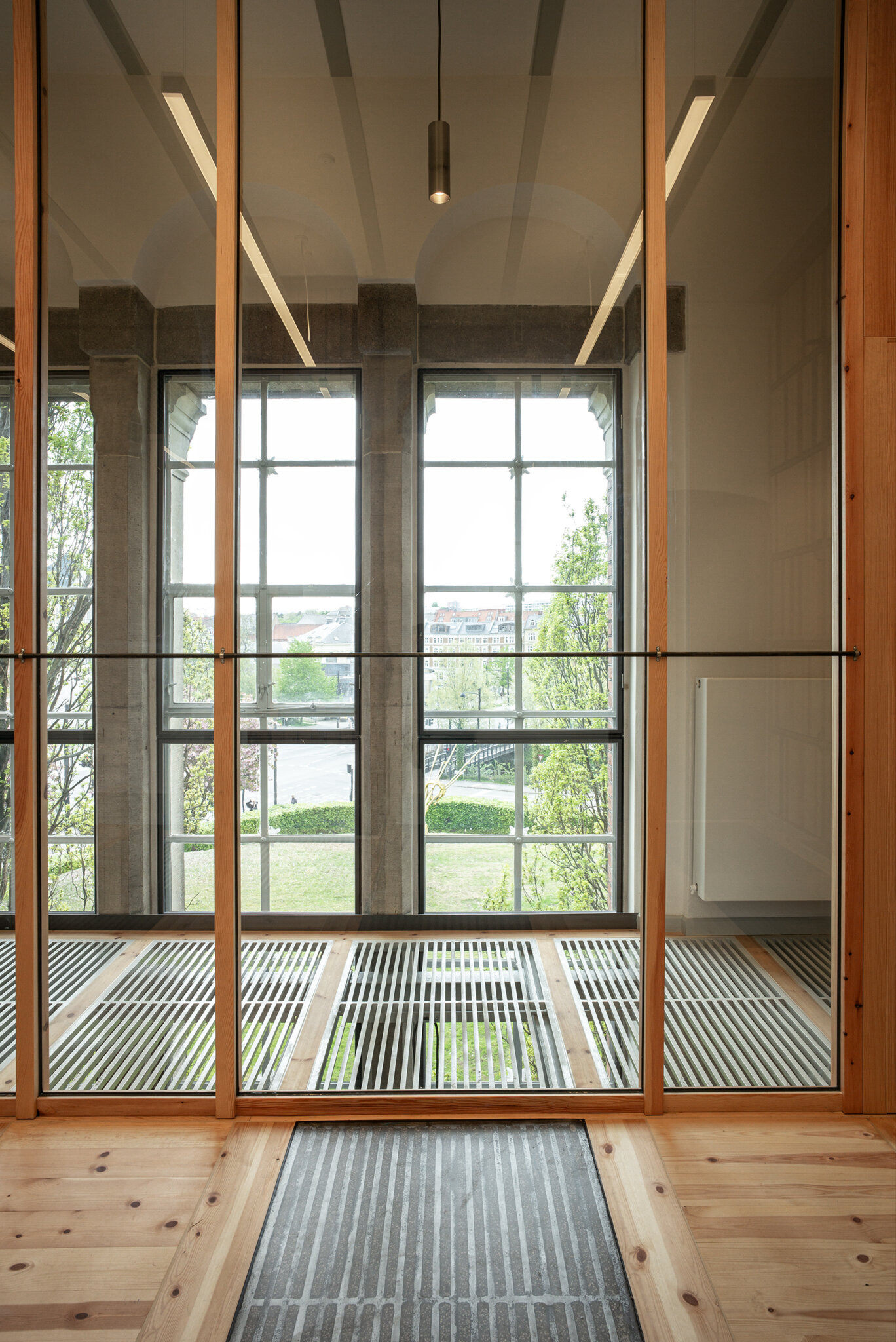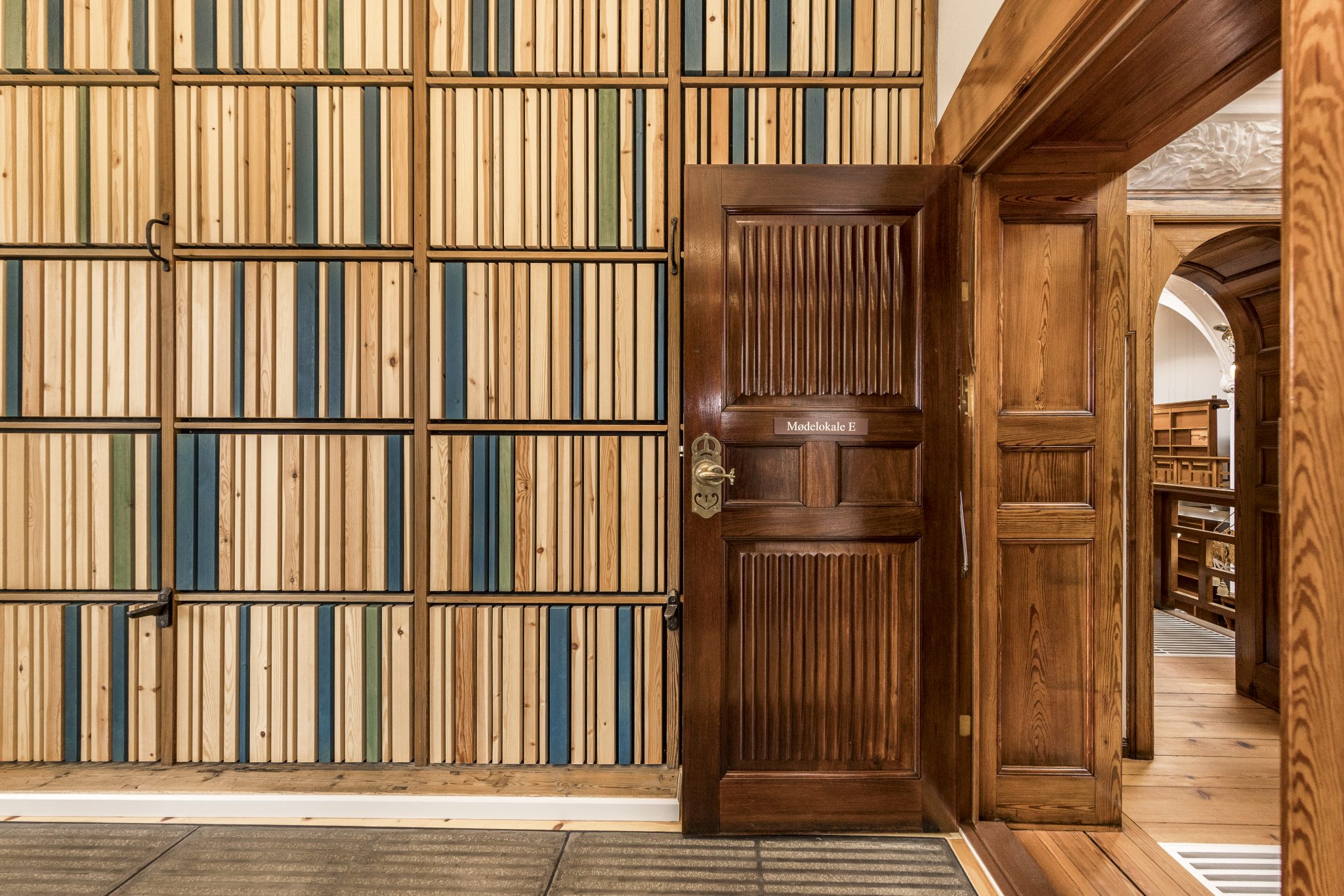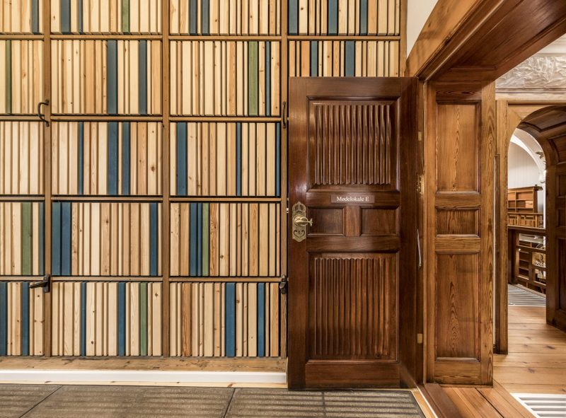 Eksisterende døre er tilføjet en massiv jernplade, således at de opnår en langt bedre lydreduktion. Jernpladerne og øvrige nye døre er udført med en enkel dekoration af lodrette spor, der refererer til de bagvedliggende fyldningsdøre.