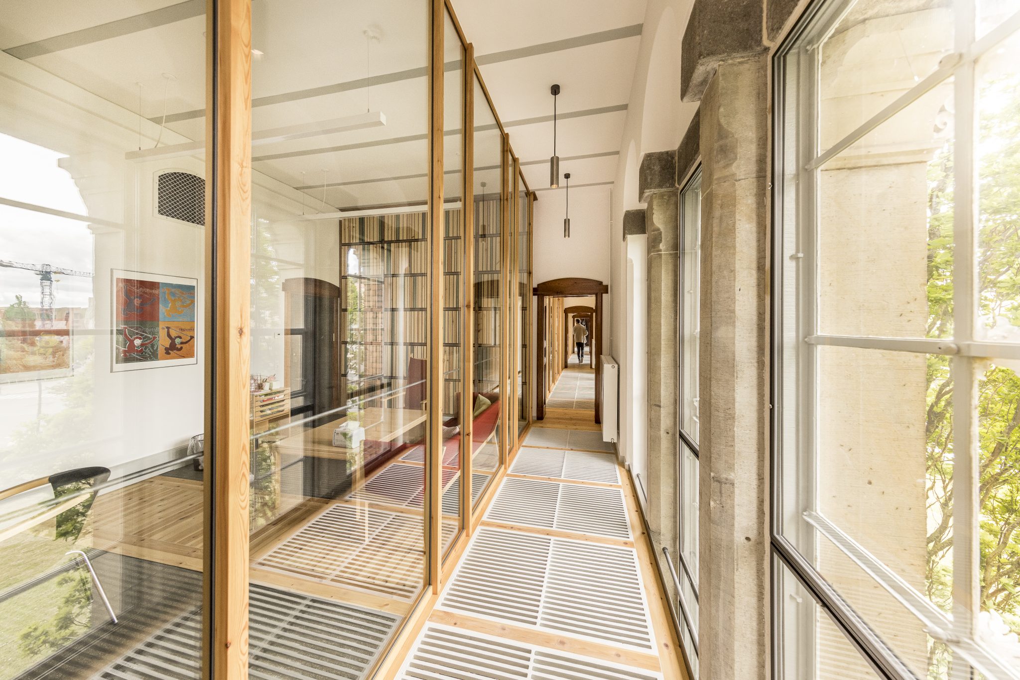 Alle overflader og det oprindelige inventar er restaureret og renoveret med respekt for den oprindelige materialitet og farveholdning. Tilføjelser er udført med de træsorter, som er brugt i bygningen. Tilføjelserne er synlige, og er derved med til at fortælle om bygningens historie. Et andet eksempel på, hvordan bygningens historie føres videre i transformationen, er ombygningen af de oprindelige dobbelthøje arkivrum, der omkranser læsesalen. De er ombygget til møderum afskærmet fra gangzonen med glasvægge. Arkivrummene var oprindeligt udført med åbne ristedæk i støbejern - disse er nu udstøbt med beton i de nye møderum, med en klar fortælling om den tidligere funktion. I gangområderne er de stadig åbne og med til at fortælle historien om en bygning, der var meget transparent gennem alle etagerne.