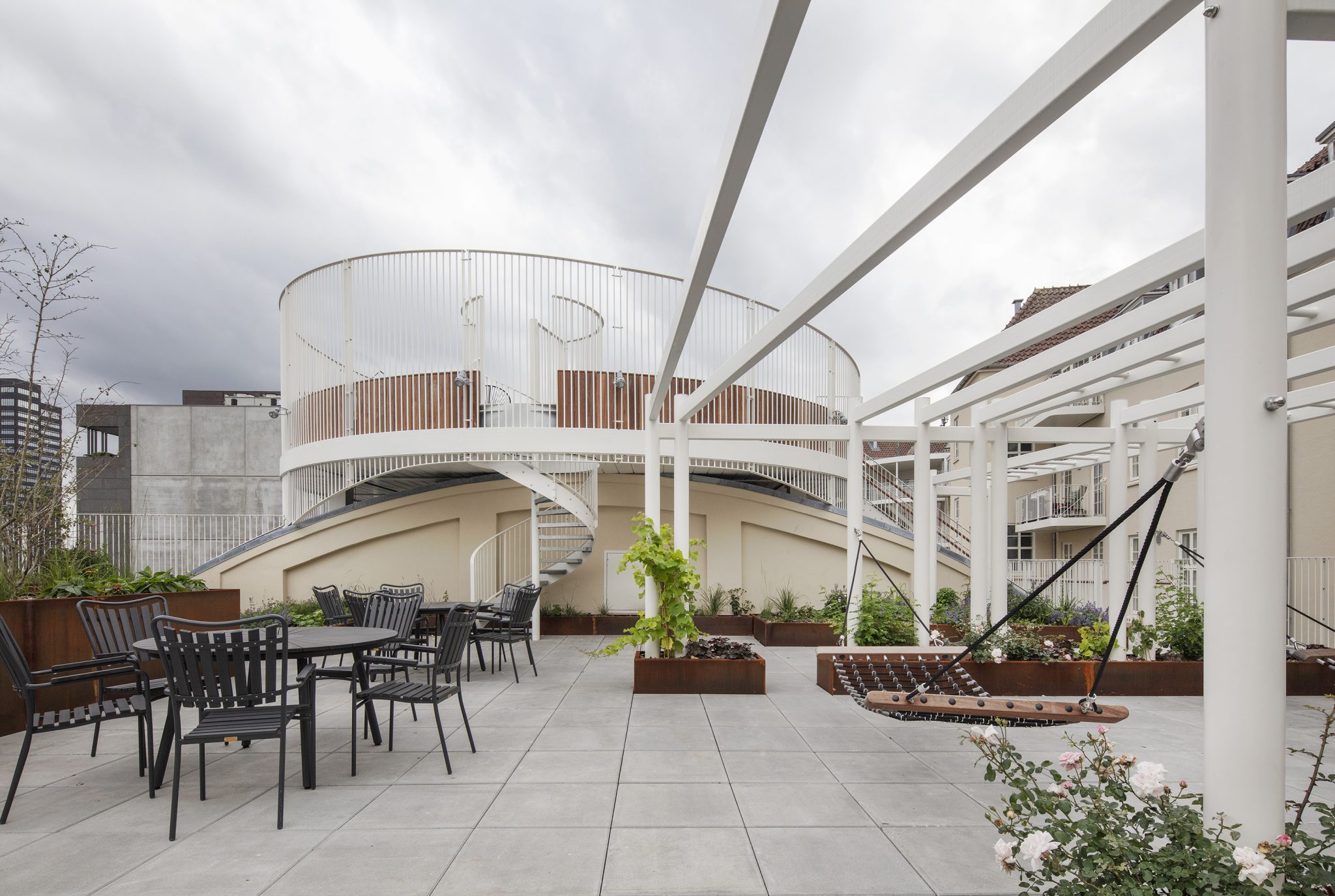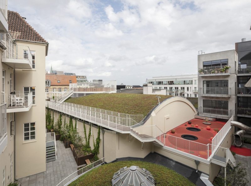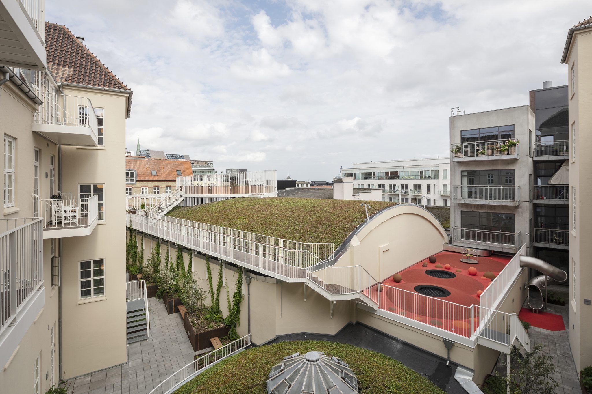 Indretningen af gårdrummet er et eksempel på, hvordan et uudnyttet byrum er inddraget og opgraderet med helt nye funktioner, der øger stedets og bygningens økonomiske og opholdsmæssige værdi markant – en grøn oase centralt i Aarhus til glæde for stedets beboere.
