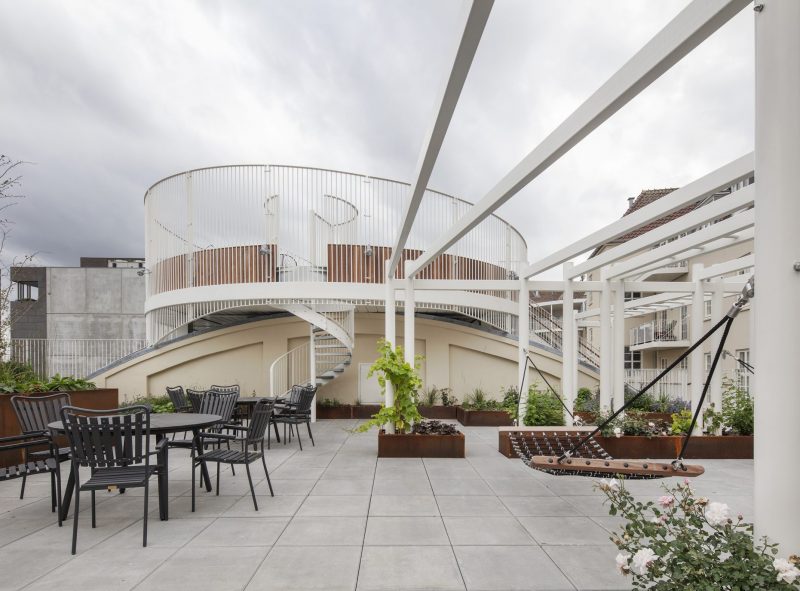 Med om- og tilbygningen har baggården ændret fuldstændig karakter. I dag er der skabt et attraktivt mødested og opholdsareal, der er karakteriseret ved en spændende variation i niveauer og forskellige tilbud til både børn og voksne. Nederst er der indrettet et gårdrum med bænke og grønne plantekasser, og længere oppe – på taget af den gamle biografsal – er der designet lege- og tumleplads med bl.a. trampoliner, balancekugler og rutsjebane ned til gården. Den hævede legeplads forbindes via en gangbro med stedets primære tagterrasse, der også ligger hævet over gården – her er der sol hele dagen, opholdsmøbler, hængekøjer og bede, hvor der bl.a. er plantet krydderurter, som beboerne kan bruge og dyrke. Øverst – svævende på taget over den gamle biografsal – er der etableret en rund terrasse som et ekstra opholdsareal og med en enestående udsigt over byens tage. Taget af den gamle biografsal og kuplen er beklædt med grønne, klimavenlige sedumtage, som udover sine tydelige æstetiske kvaliteter, har integreret regnvandshåndtering, der aflaster byens kloaksystemer ved kraftige regnskyl ved at tilbageholde op mod 65 liter vand pr. kvadratmeter .