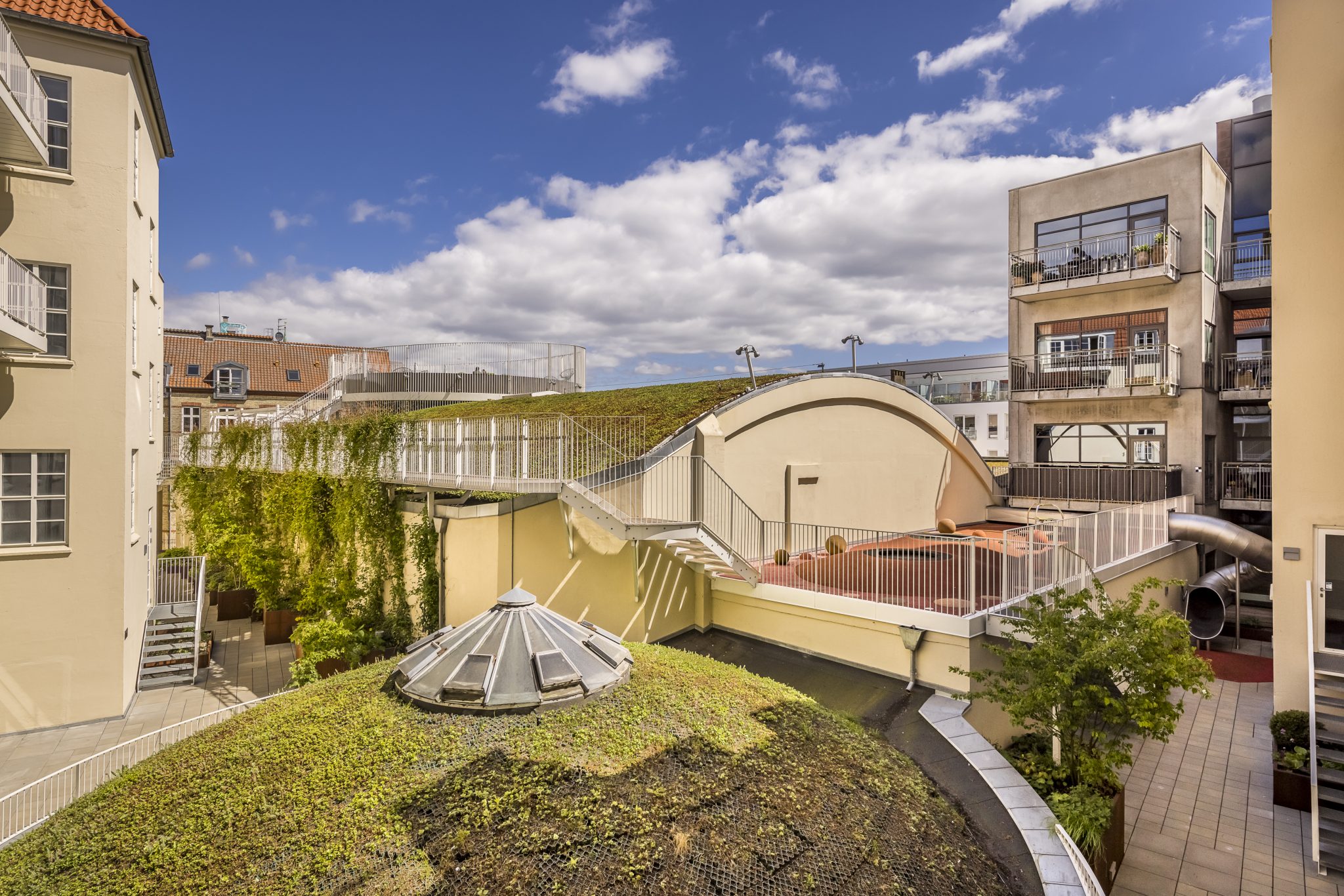 Derudover har man i designet af gårdrummet anvendt grønne, klimavenlige sedumtage på de flader, hvor det var muligt – bl.a. på taget af den eksisterende kuppel og den gamle biografsal. Sedumtage virker isolerende på bygninger og har, udover sine åbenlyse æstetiske kvaliteter, en række klimamæssige fordele. Blandt andet er de grønne tage med til at understøtte en bedre biodiversitet i byen ved at tiltrække smådyr og bestøvere med sine planter. Derudover rummer taget integreret regnvandshåndtering, hvilket er en udfordring i byerne, hvor man mange steder kæmper med stadigt større regnvandsmængder. Sedumtaget kan tilbageholde op til 65 liter vand pr. kvadratmeter, og aflaster således byens kloaksystem ved kraftige regnskyl. (Kilde: Leverandør, Nature Impact)
