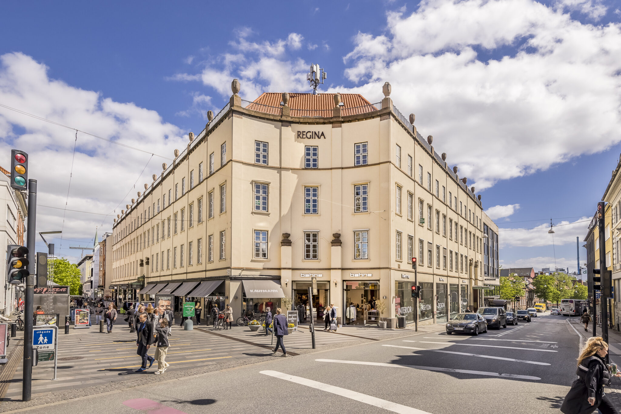 Efter transformationen af Regina har det danske livsstilsbrand Bahne indrettet konceptbutik i den store hjørnebutik. Derudover er de eksisterende lejere – Kaufmann, Paw Sko og gadens velkendte arkadegartner – igen rykket ind i større og opgraderede butikslejemål, hvor man bl.a. har givet butikkerne større vinduer mod gaden og øget loftshøjden i butikkerne for at skabe en bedre butiksoplevelse for medarbejdere og besøgende. Samtidig har man gentænkt flowet i bygningens butikker, så der skabes en naturlig passage gennem butikkerne – på den måde understøtter arkitekturen de forbrugerrettede funktioner bedst muligt.