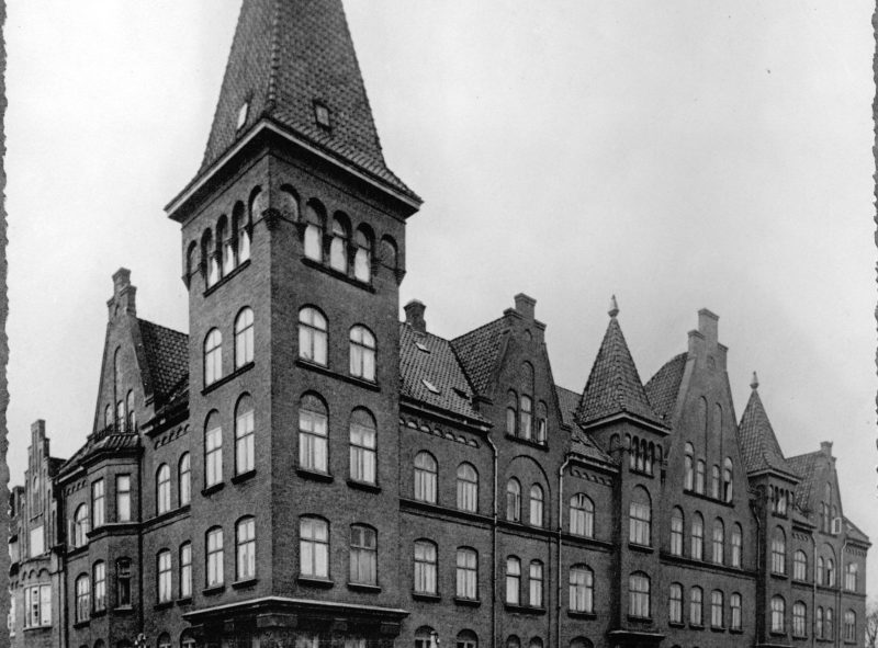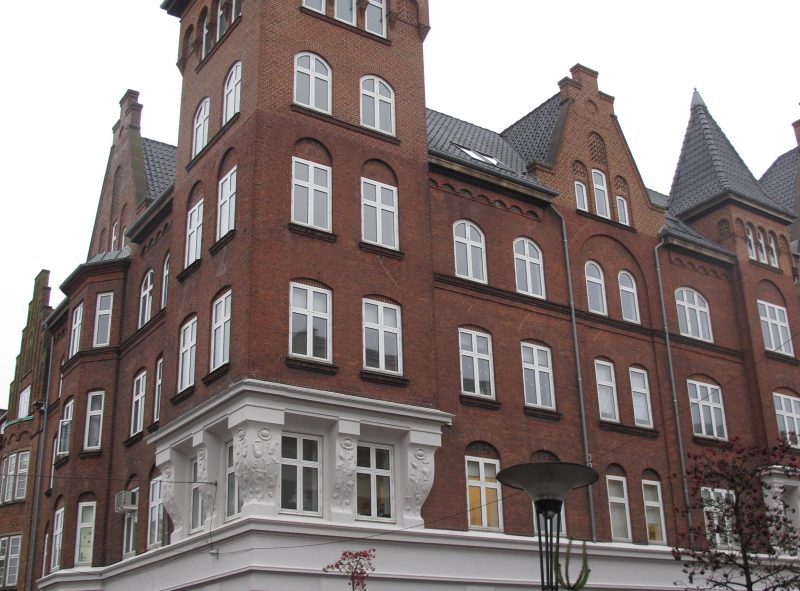Facaden fremstår i rød blank mur med kvaderfuget, pudset stuefacade og med meget detaljeret udsmykning som mønstermurværk og pudsede bygningsdetaljer, murede sålbænke og gesimser samt karnapper og frontgavle. På bygningshjørnet rejser sig et stort firkantet tårn i seks etagers højde.