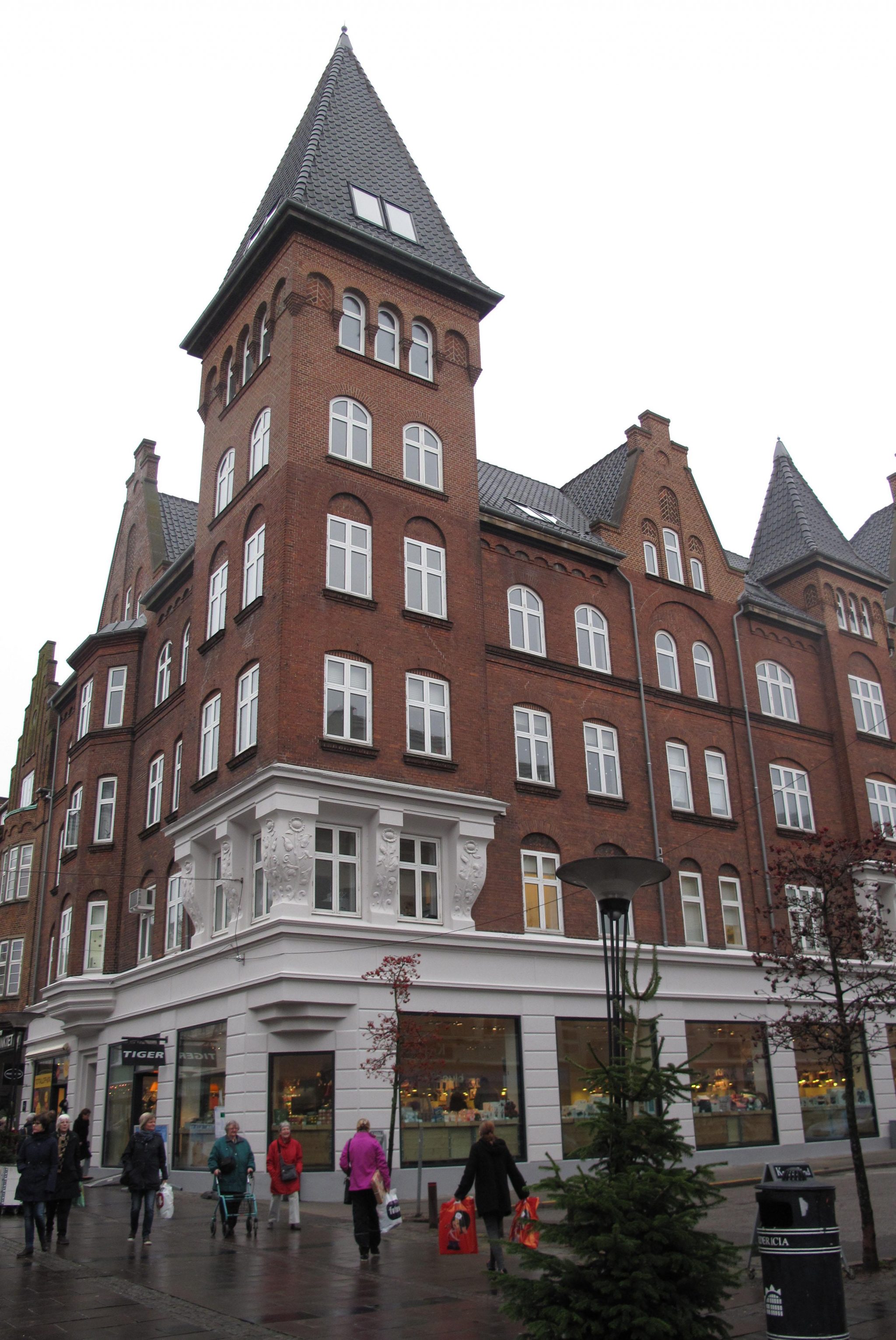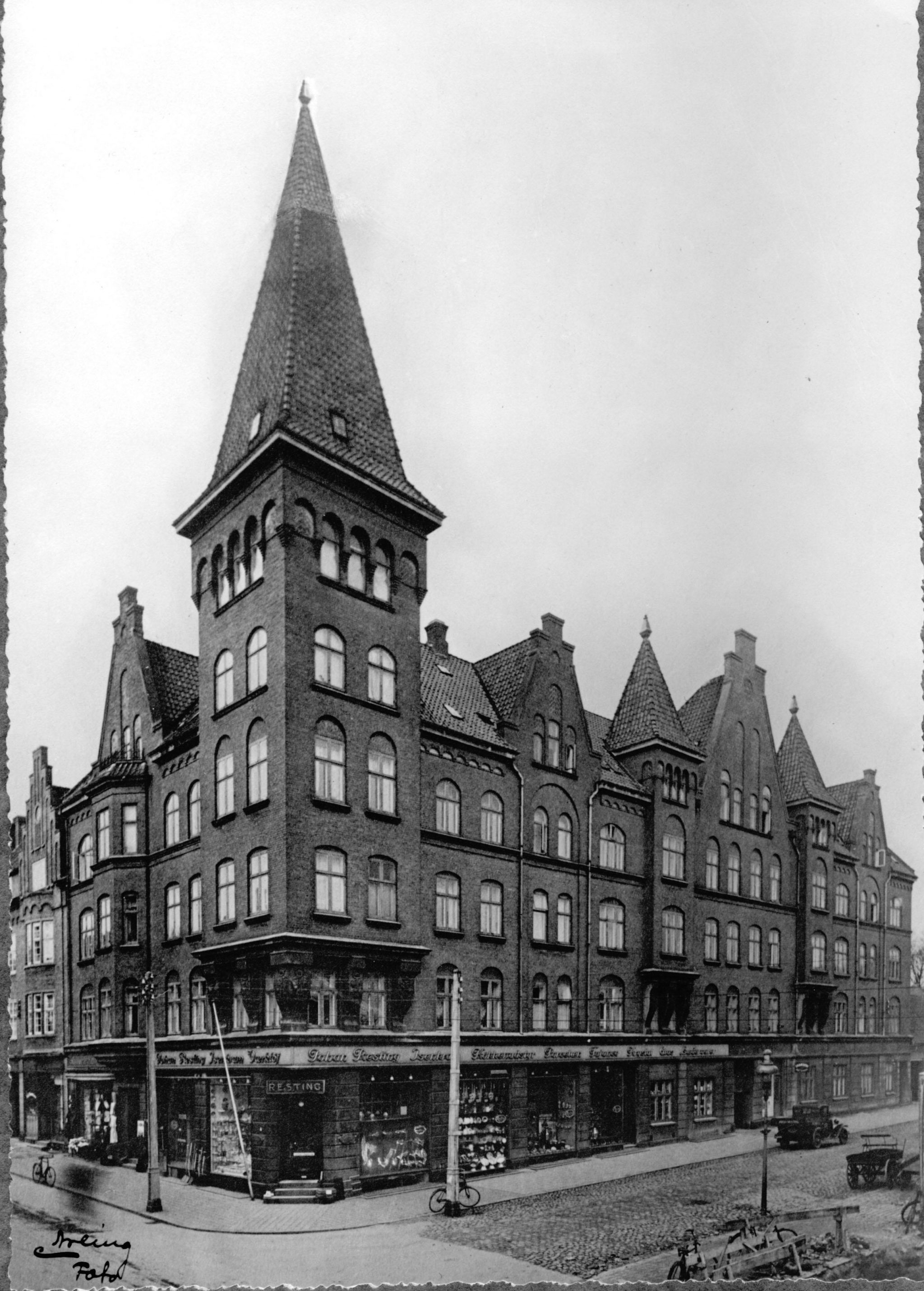 Ejendommen er opført i fire etager med 6 butikker i stueetagen og store herskabslejligheder på 4-6 værelser på de øvrige etager.