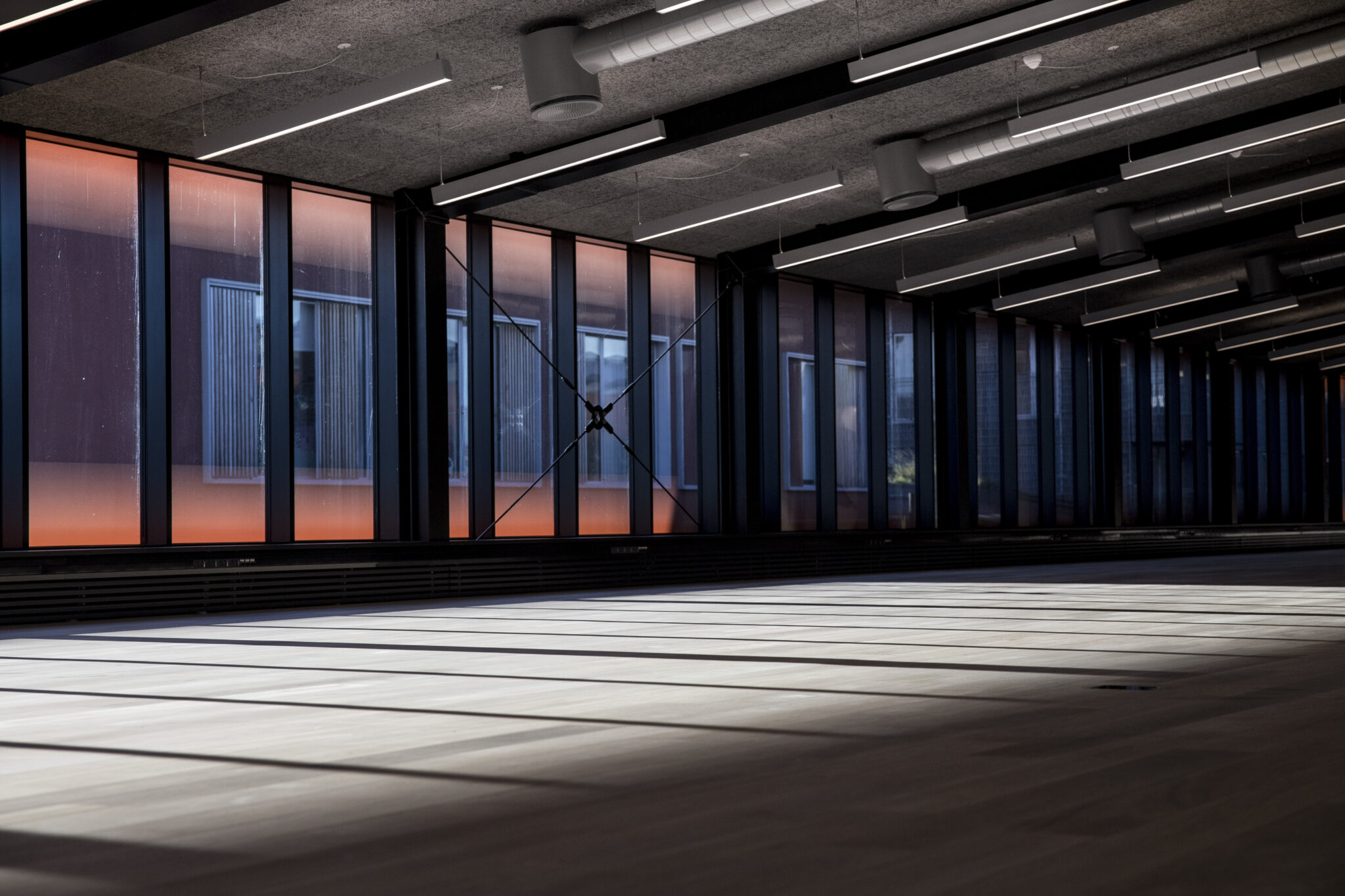 Det samme gælder for de store, solafskærmende glasfacader på 1. sal, der sikrer et behageligt indeklima og et mindre behov for aktiv opvarmning og nedkøling.