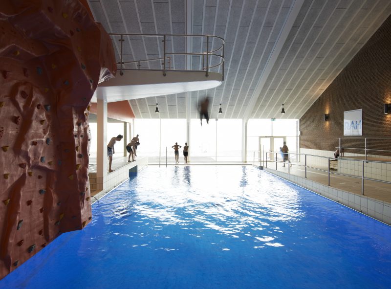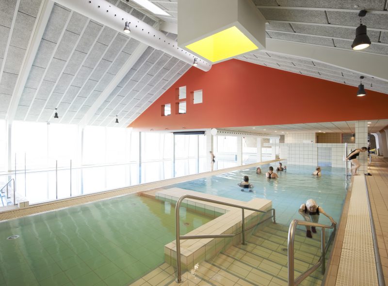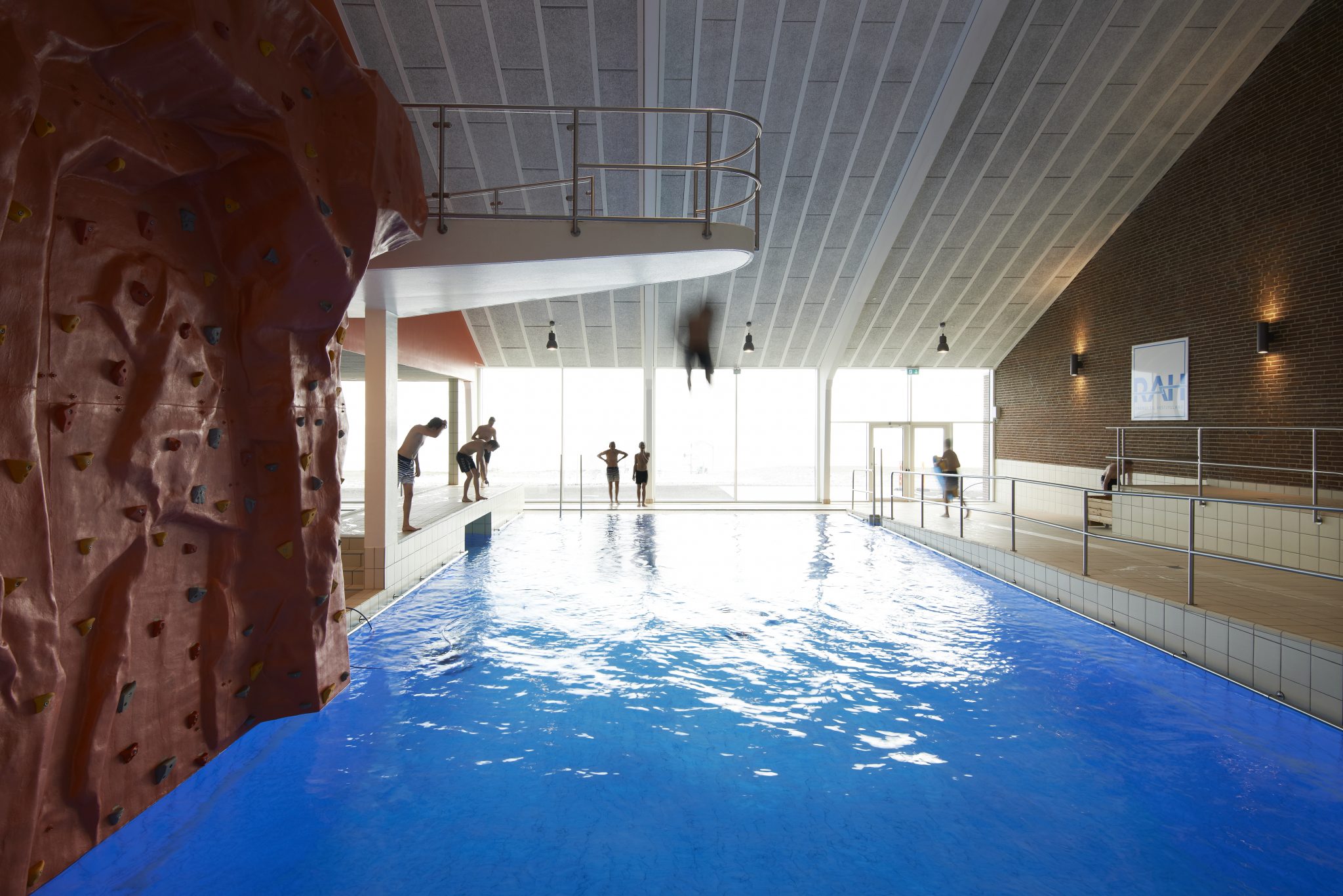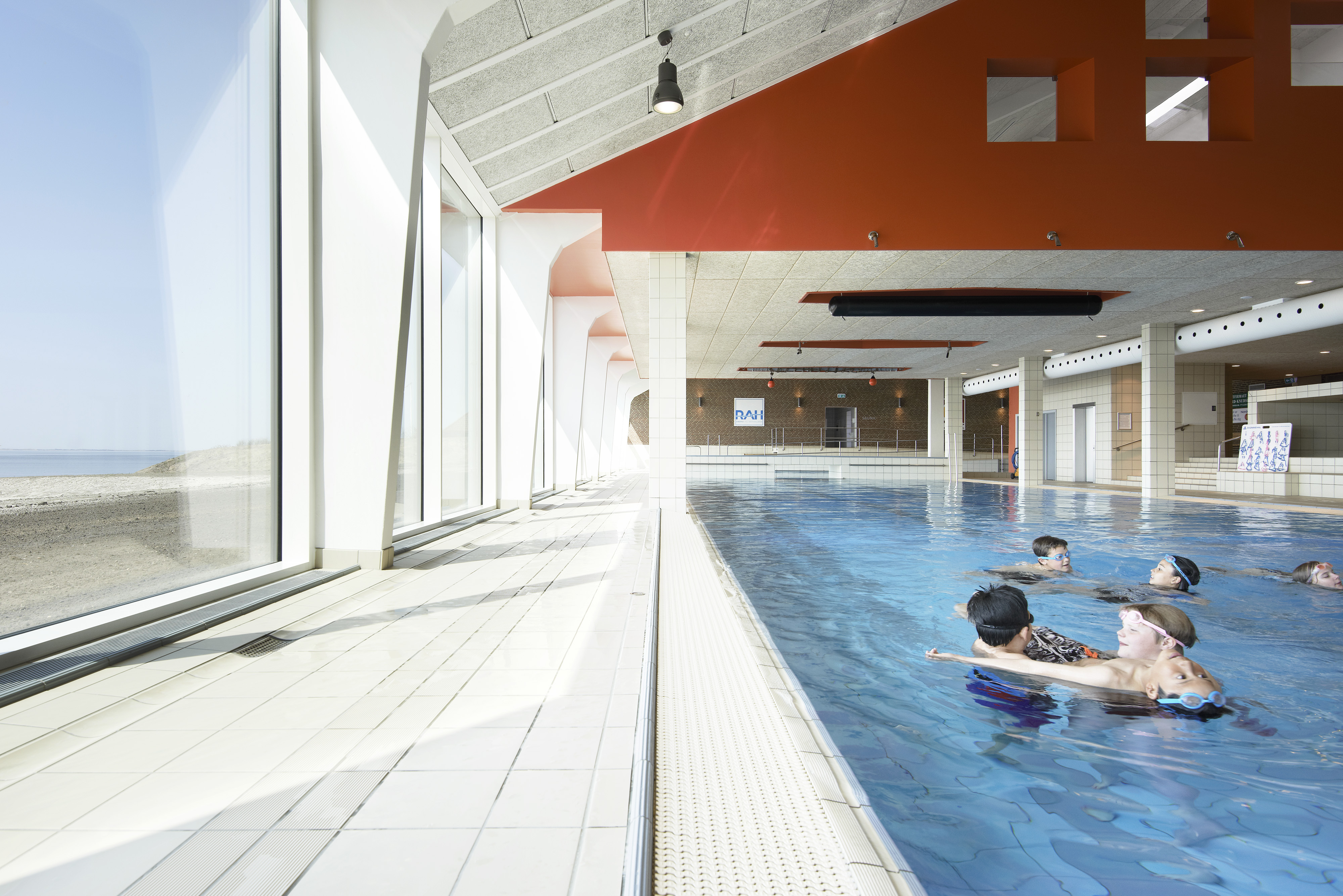 Mod vest blev facaden åbnet så man tydeligt kunne opleve sammenhængen til fjorden. Ny bassiner i forskellig størrelse gav ny fleksibilitet og hallens store volumen blev overbevisende udnyttet ved at indskyde en ny etage med fitness center og en fornem udsigtsterrasse.