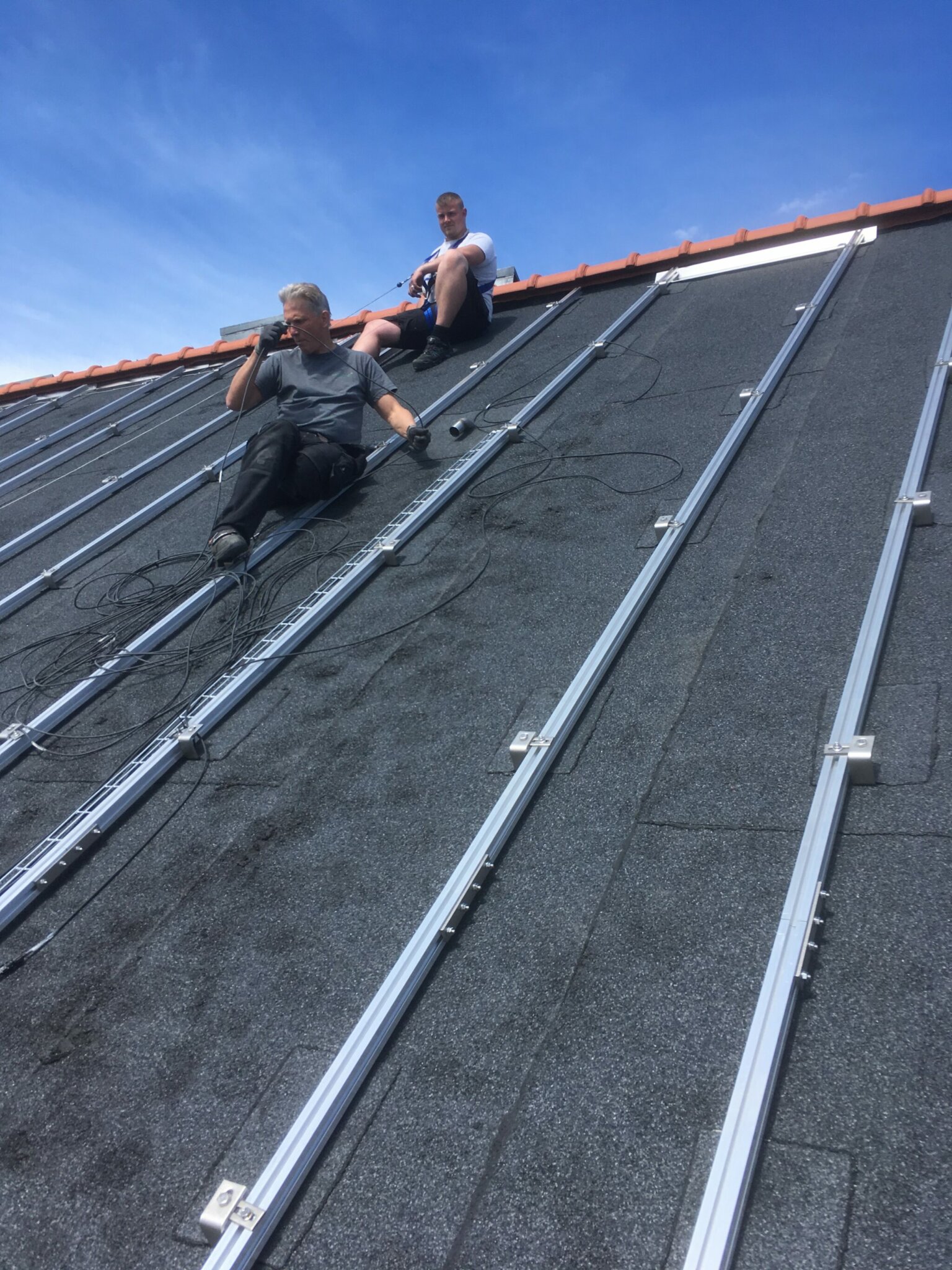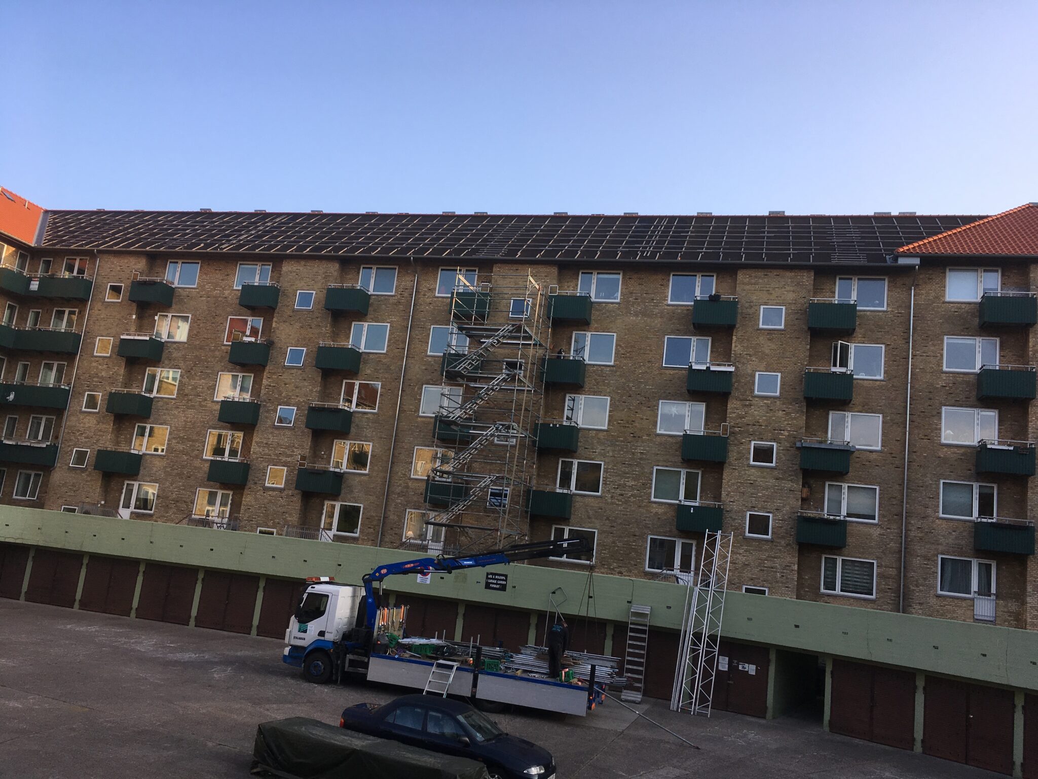 Udført i 2019. Der blev først udlagt vandtæt undertag, monteret rustfrie stålvinkler. på siden af disse blev der monteret lasker med aluskinner lodret, solcellepaneler blev oplagt vandret af arkitektoniske årsager pga. fladens udformning. Solcellepaneler blev fastgjort med indfarvede røde beslag til alu skinnerne -kabelkasse blev indfarvet . Der blev inddækket med zink / aluvinkler i sider langs skotrenderne