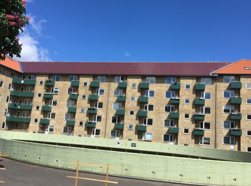 Nyt udbud i 2018 blev vundet af Solar Lightning Entreprise ApS med en bedre løsning med indfarvede mono standardsolceller fra Sunerg i Italien på 275 wp x 190 stk. / 52,25 kWp i RAL 8016 på en selvstændig tagflade på 345 m2 mellem 2 skotrender incl. 13 stk. “dummies” skræddersyet til skotrendernes vinkel.