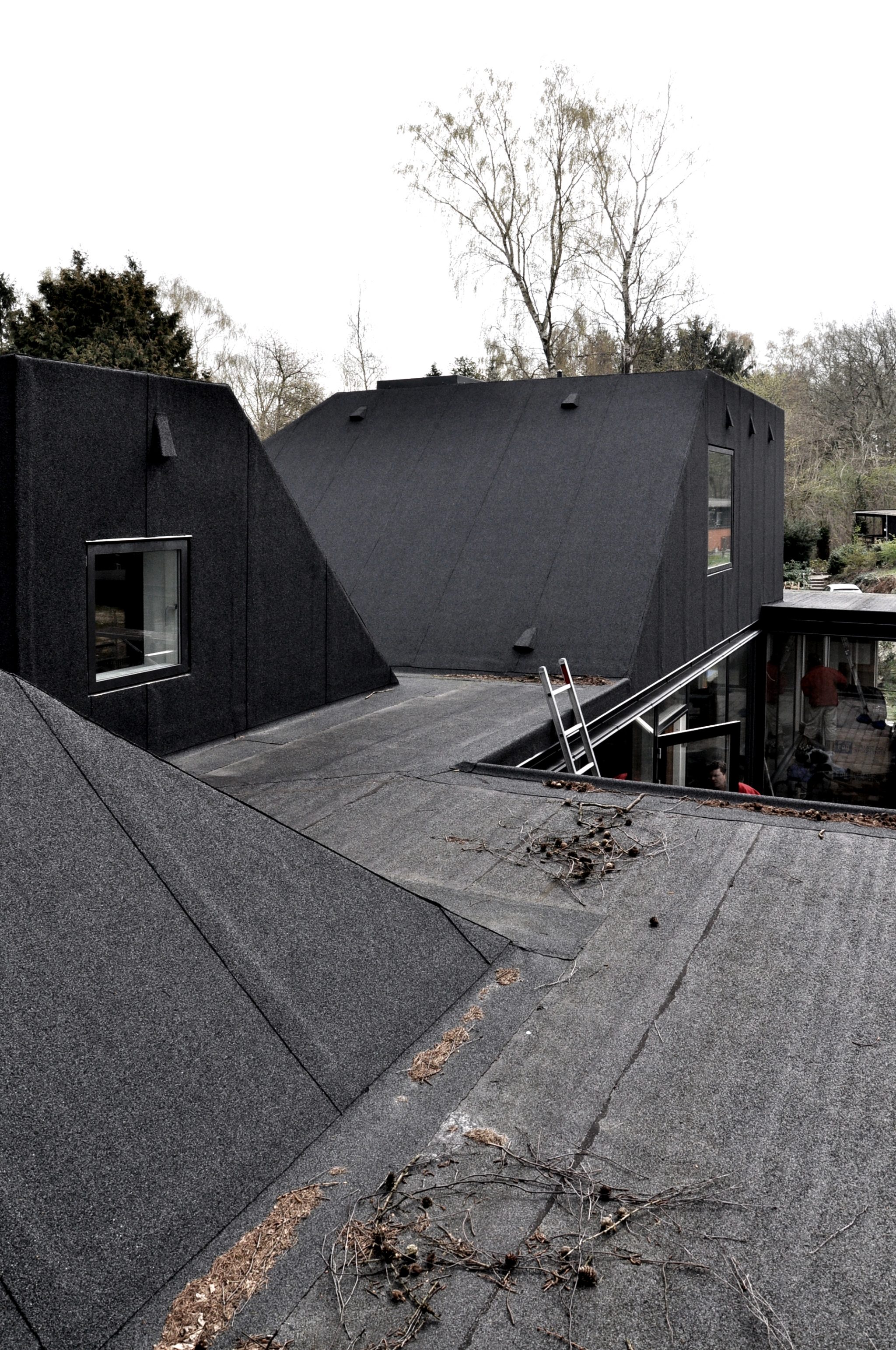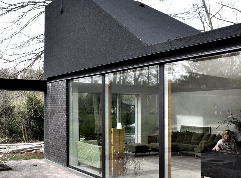 Huset ligger i landzone og udfordringen har derfor været at bygge til, uden at udvide husets fodaftryk på grunden. I stedet udvider boligen sig opadtil i en række taghuse, der rummer børneværelse, legehems, arbejdshems og ovenlys. Taghusene er bygget til det eksisterende tag og beklædt med tagpap. Tagfoden i overgangen fra facade til tag har fået en særlig bearbejdning, og huset er blevet tilføjet en overdækning, som binder husets to fløje sammen og danner en overdækket terrasseareal mod sydvest. Husets facade er efterisoleret udvendigt og de gule teglskaller er erstattet af en muret facade med vinduesåbninger fra gulv til loft i alle rum. Arbejdet med husets indre transformation pågår og omfatter bl.a. nyt køkken, nye trægulve i hele huset, trapper til hemse og tagværelse, nyt forældresoveværelse og badeværelse.