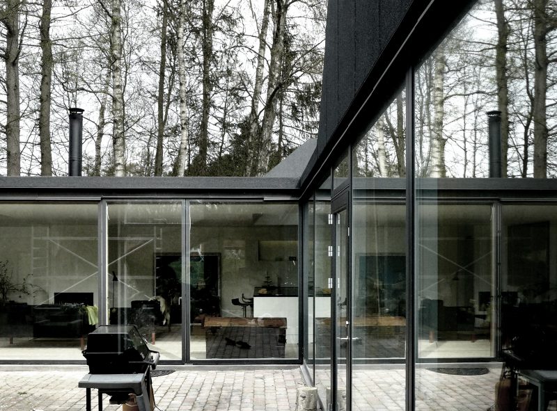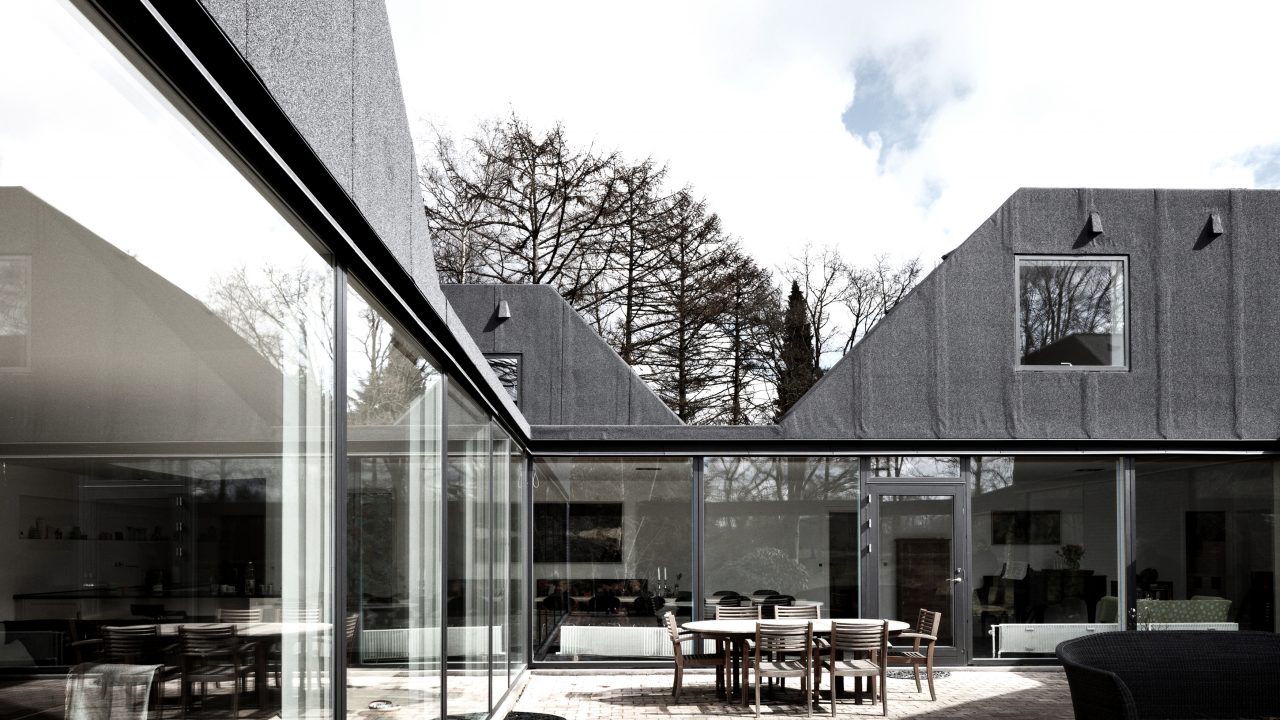 Totalombygning af villa i smukke landskabelige omgivelser præget af store træer. Huset er bygget i 60’erne som et dobbelthus i én etage med et relativt lukket ydre og en mere åben facade imod et gårdrum. Husets indre var præget af små og forholdsvis mørke rum med højtsiddende vandrette vinduer. Bygherrens ønske var at omdanne huset til en tidssvarende bolig for familien, som har tre børn. Dette omfattede både en transformation af husets indre og ydre, samt en mindre udvidelse af husets areal. Særligt fokus har været på at skabe bedre lysforhold, sammenhæng imellem ude og inde og bedre rum til alle familiens medlemmer.
