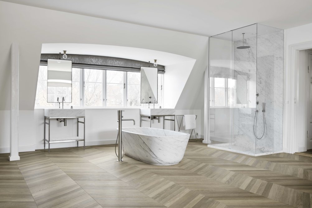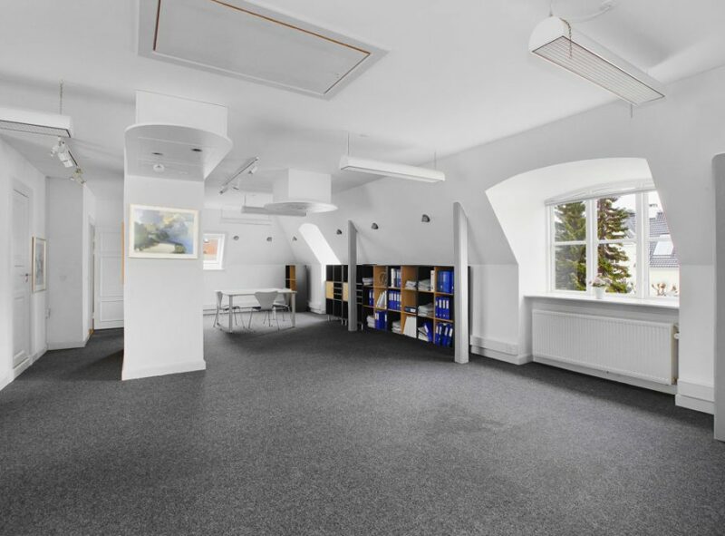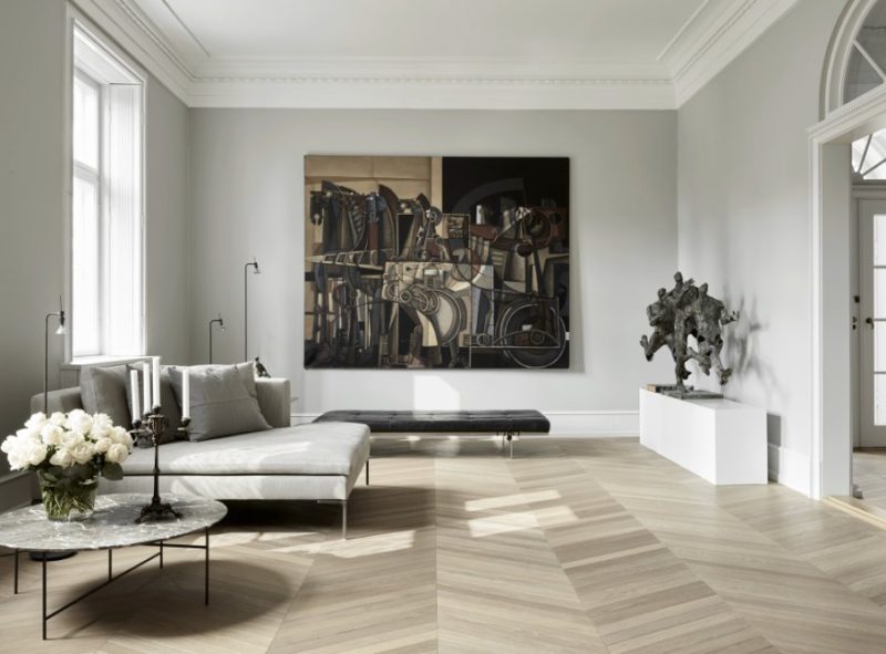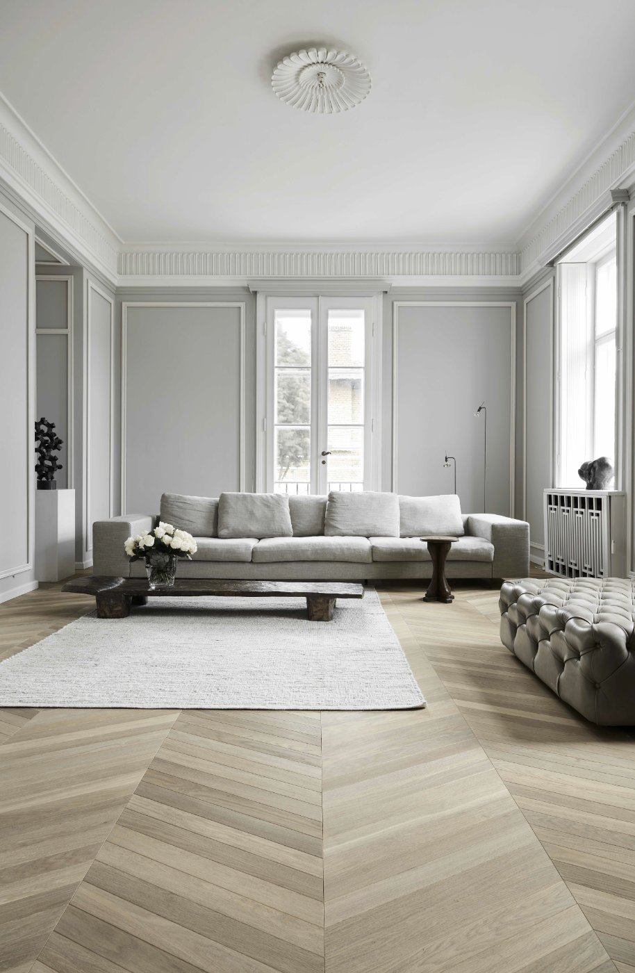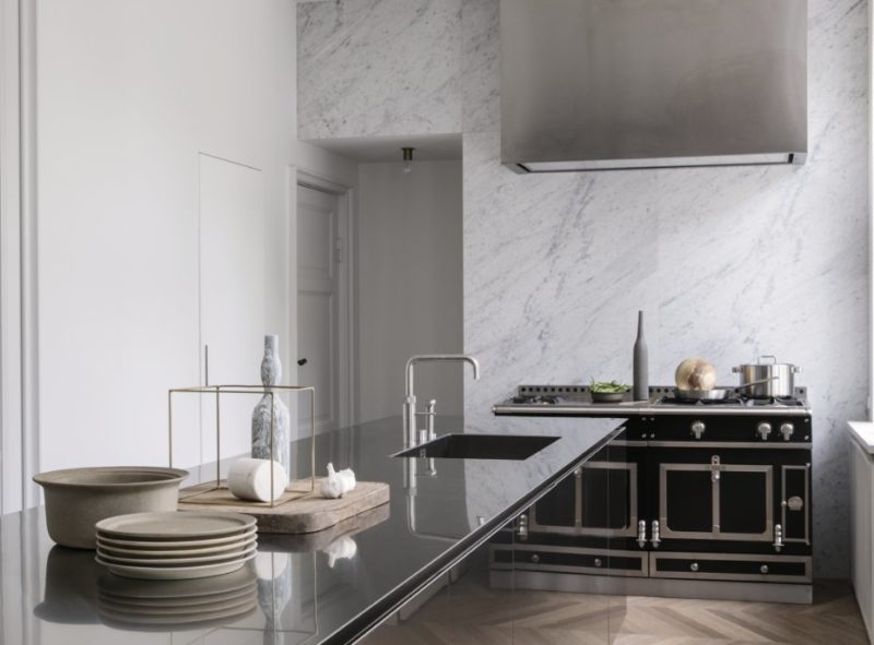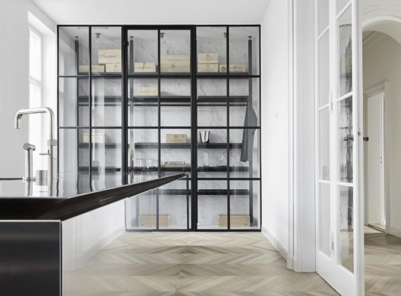 Huset, der tidligere fungerede som domicil for KFI, var opdelt i mindre kontorer, hvilket betød en større nedrivning og genetablering af lofter, gulve og dørpartier. I forbindelse med etablering af køkken blev dette skabt ved nedlæggelse af 4 mindre kontorer. Der var kork på gulvene og nedsænkede lofter. Tanken bag køkkenet var at genskabe et herskabeligt rum med referencer til husets fortid. Derfor er der brugt fx den klassiske Carrara marmor, som man ofte finder i herskabelige boliger fra den periode. Gulvene er lagt i voksbehandlet chevron parket, som er designet til huset i samarbejde med Trækompagniet. Gulvet er nu i produktion under navnet Eg Toscana Chevron. Der er valgt et klassisk fransk komfur for at understrege den lidt parisiske stemning sammen med et stort specialtegnet køle / svaleskab / spisekammer. Alt sammen elementer, som er med til at understrege den lidt poetiske atmosfære. Køle /svaleskabet blev fremhævet i DR Hammerslag 2019 for nyfortolkning af fadebur / spisekammer. Køkkenøen er 5, 5 meter lang og udført i rustfrit stål. Bygherren er meget interesseret i moderne kunst og bl.a. den amerikanske kunstner Donald Judd, derfor valgte vi en højglans poleret rustfri stål for at lege med spejleffekten. I løbet af dagen giver lysindfaldet en spejling af trægulvet. På den måde opnår man en effekt af, at køkkenøen nærmest forsvinder og bliver gennemsigtig. Det giver en smuk stilren og skulpturel kontrast til de klassiske rammer.